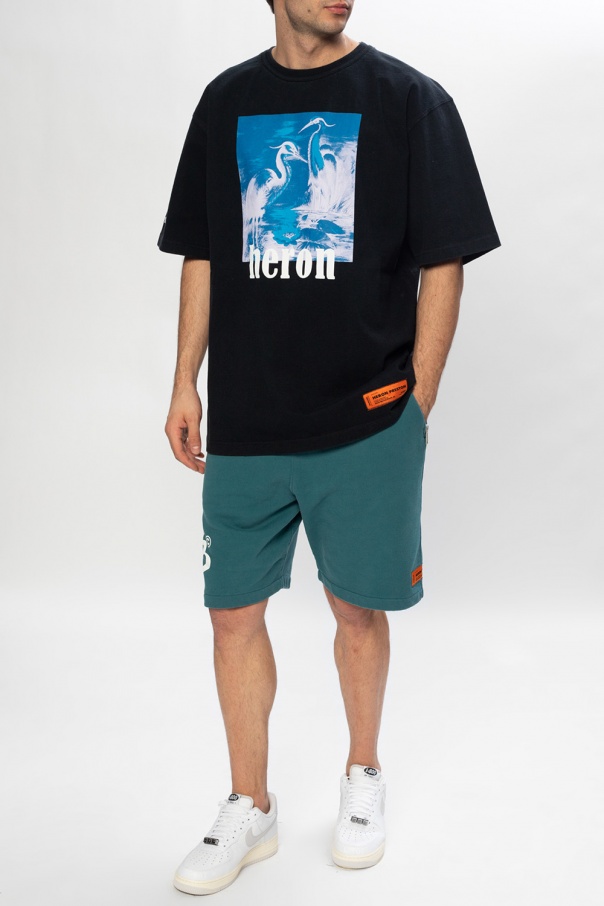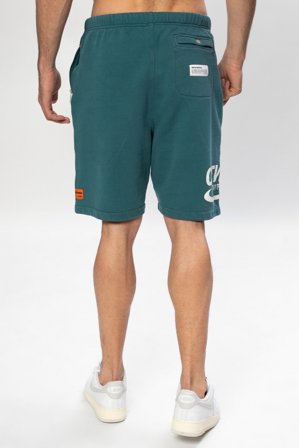 Blue shorts from Heron Preston. Boasting a white graphic print and an orange and black branded patch, this cotton-crafted pair is complete with an elasticated waistband with a drawstring fastening, two zipped pockets and one snap-fastened pocket.