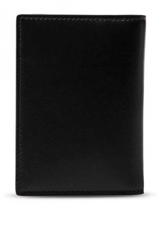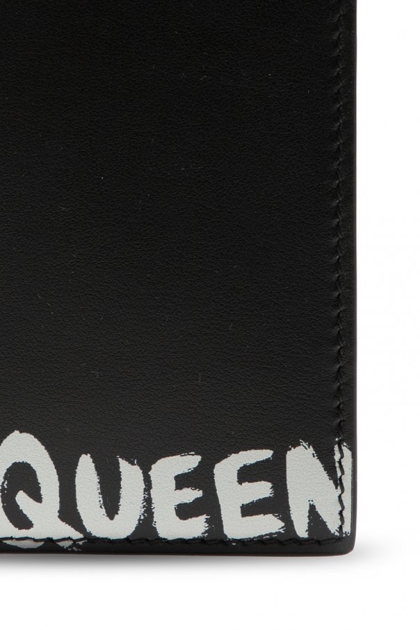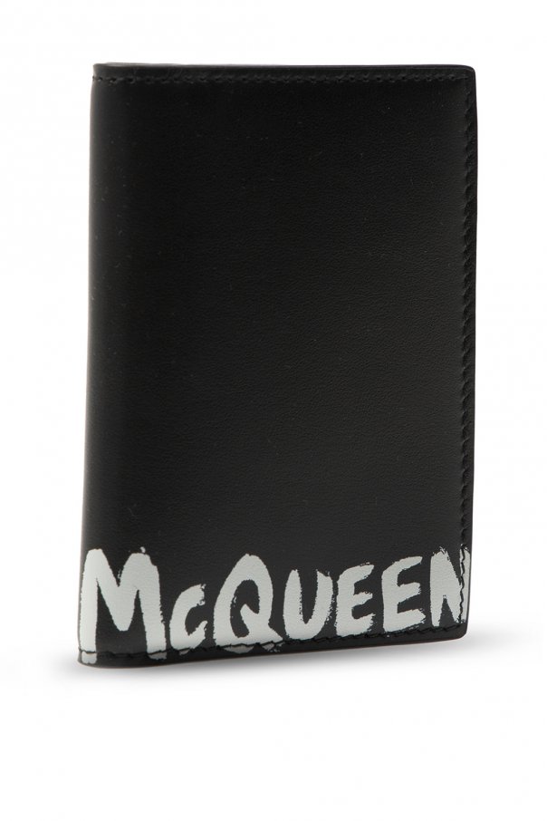 Black bifold wallet from Alexander McQueen. Decorated with a white logo print. 6 card slots and 2 slip pockets inside.