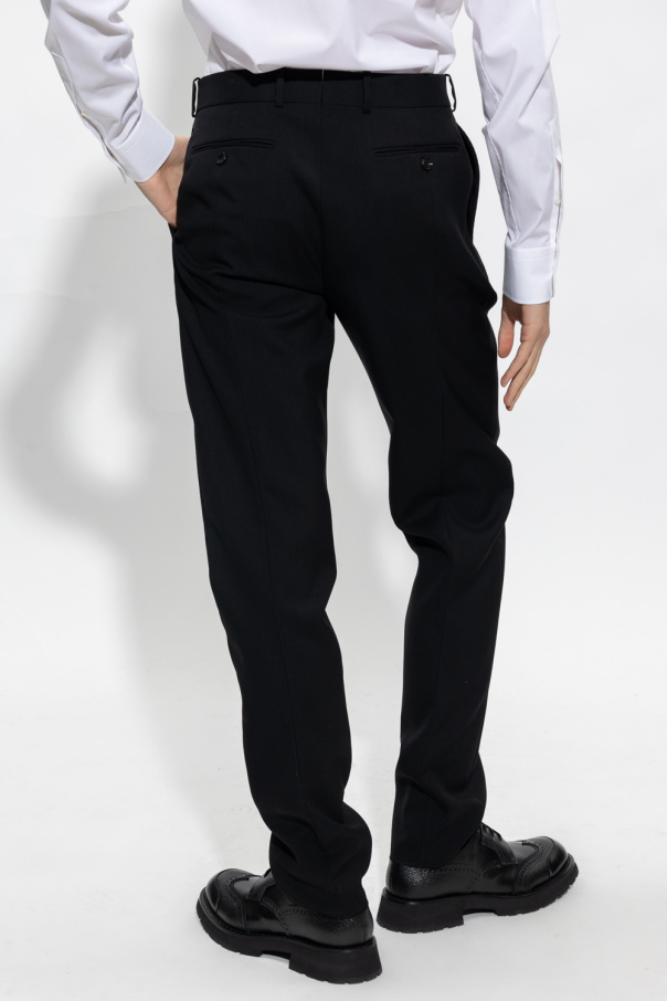 Black trousers from Alexander McQueen. Crafted from wool, this pair falls with tapered legs and features a zip fly with a button and a hook, two front slip pockets and two back button pockets.