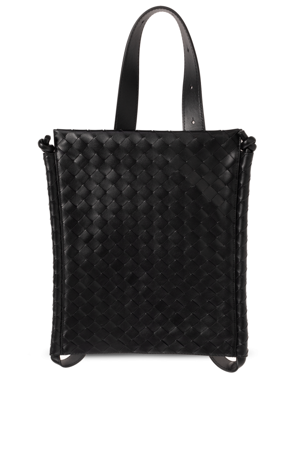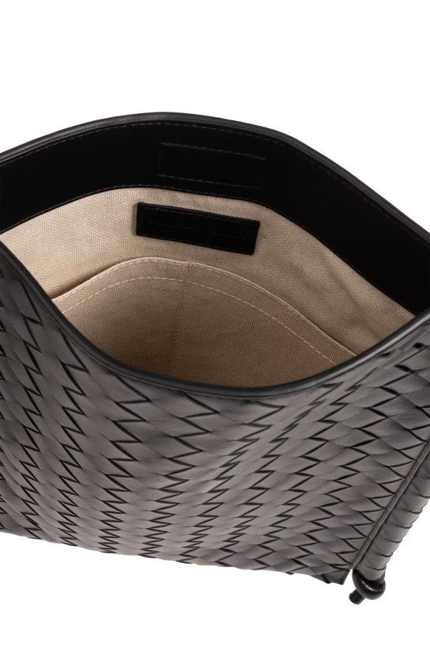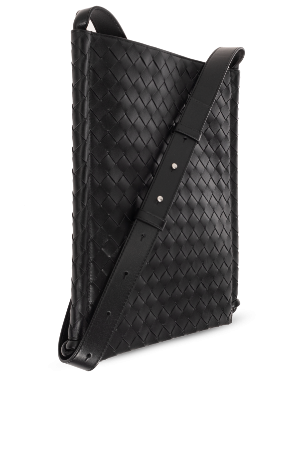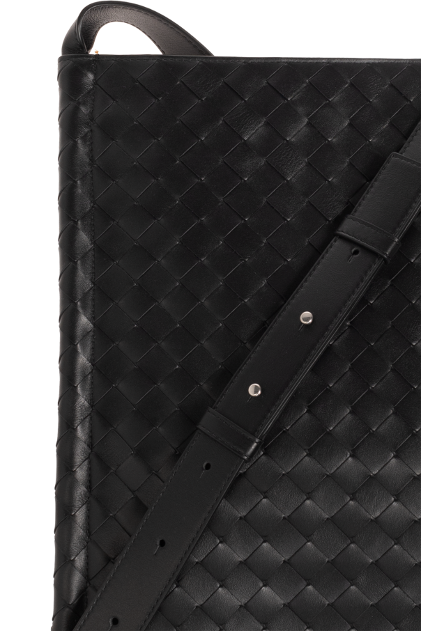 Black ‘Flat Loop Large’ shoulder bag from Bottega Veneta. Made of calf leather accentuated with the brand\'s signature Intrecciato weave, this design fastens via a magnetic snap and features an adjustable shoulder strap, silver-tone metal hardware and one internal compartment with a partition and two slip pockets.