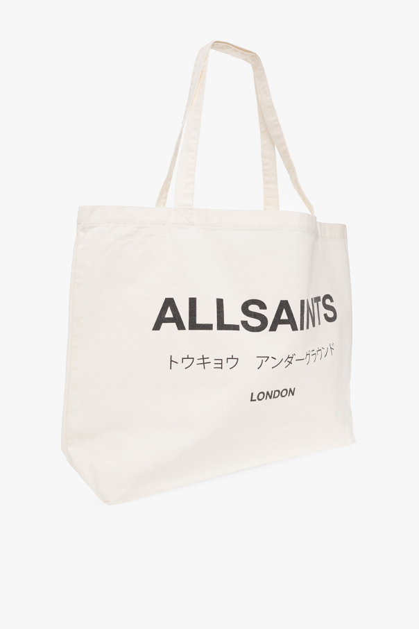 Cream ‘Underground’ shopper bag from AllSaints. Crafted from cotton, this design showcases a black logo print, two handles and one internal compartment.