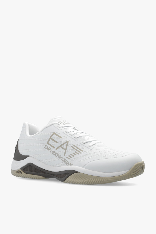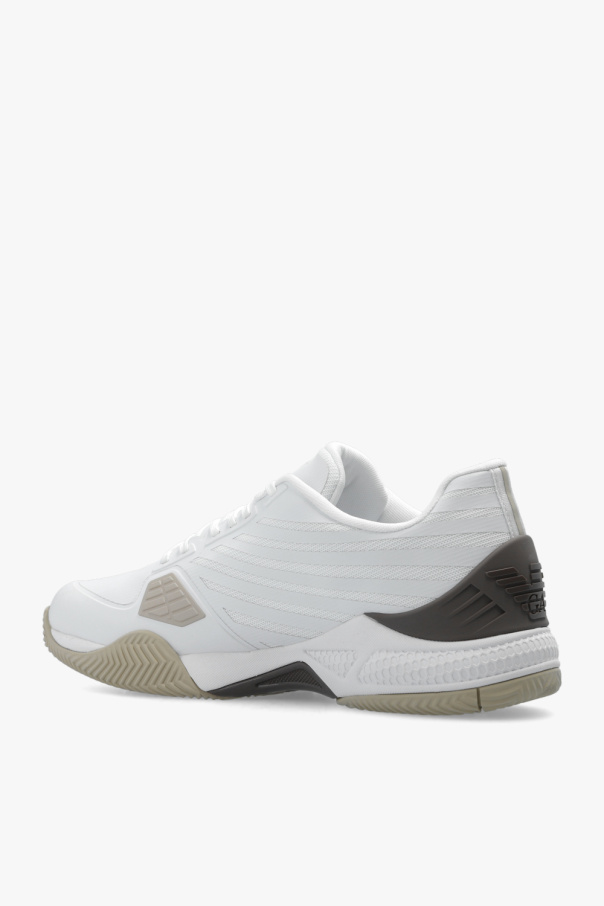 White sneakers from EA7 Emporio Armani. Made of fabric, this lace-up pair is complete with rubber inserts, a beige logo and rubber sole in beige, brown and white.