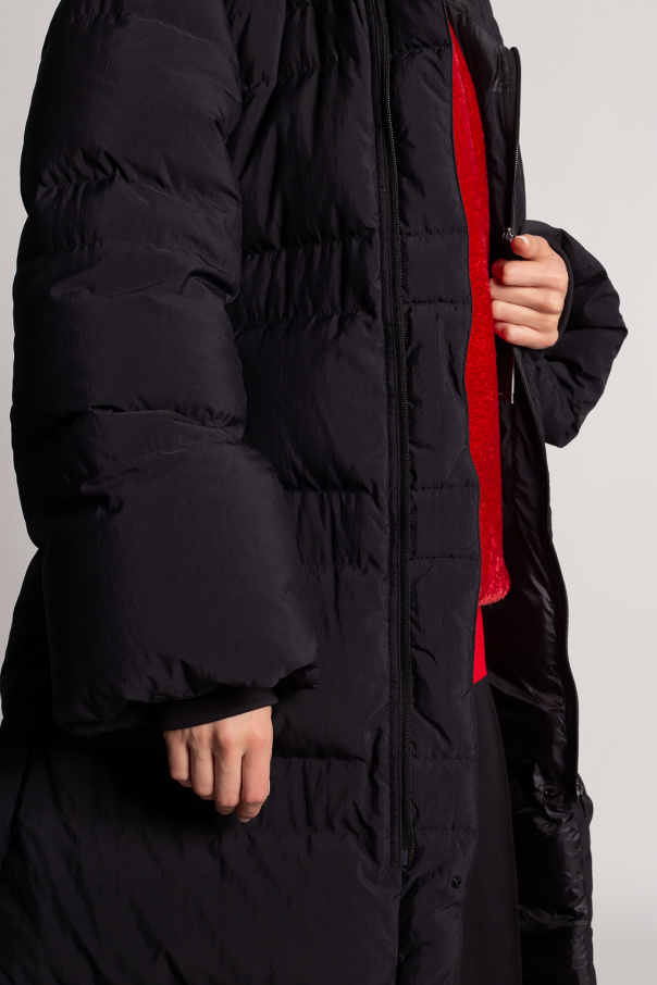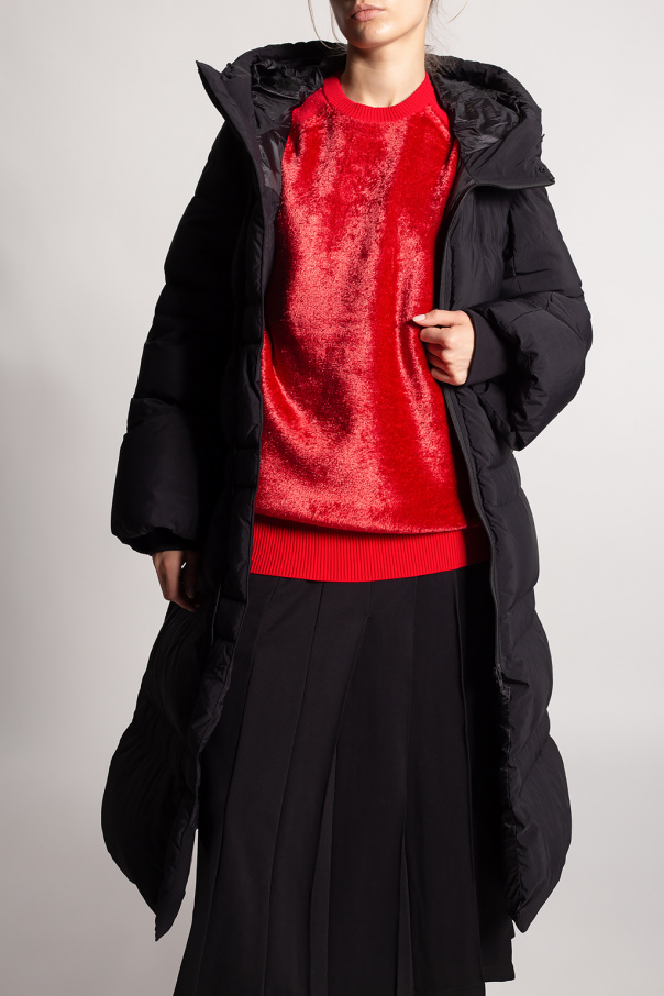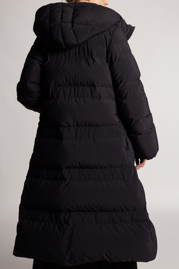 Black down coat from Y-3 Yohji Yamamoto. Fastened with a zip, this garment features a drawstring hood, two zip pockets, slits and long sleeves with ribbed cuffs.