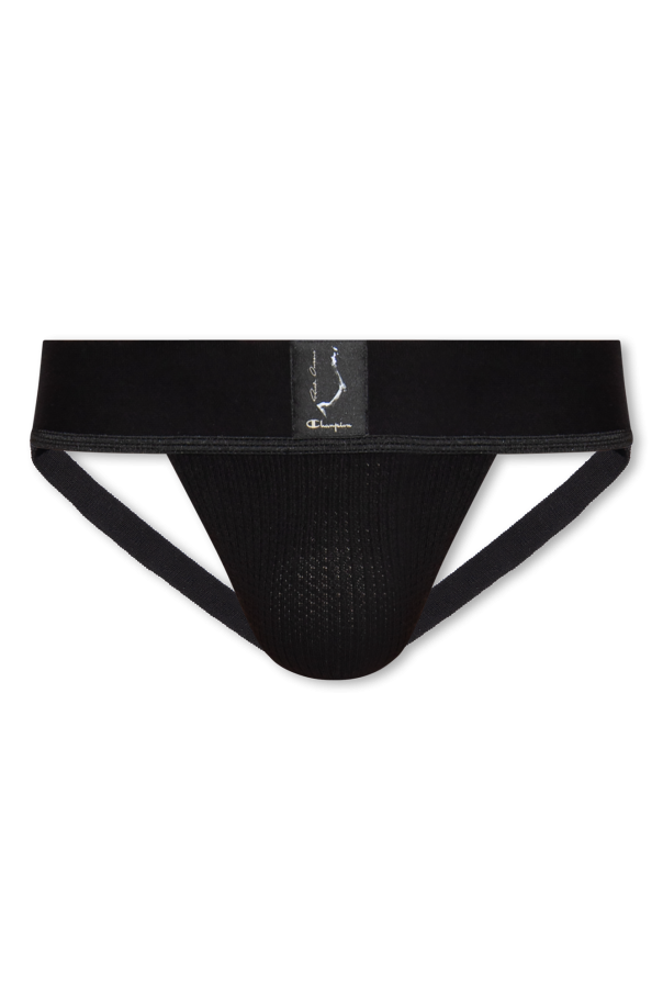 Black jockstrap from Rick Owens x Champion. Made of a blend of cotton and organic cotton, this design features an elastic waistband and logo patch on the front.