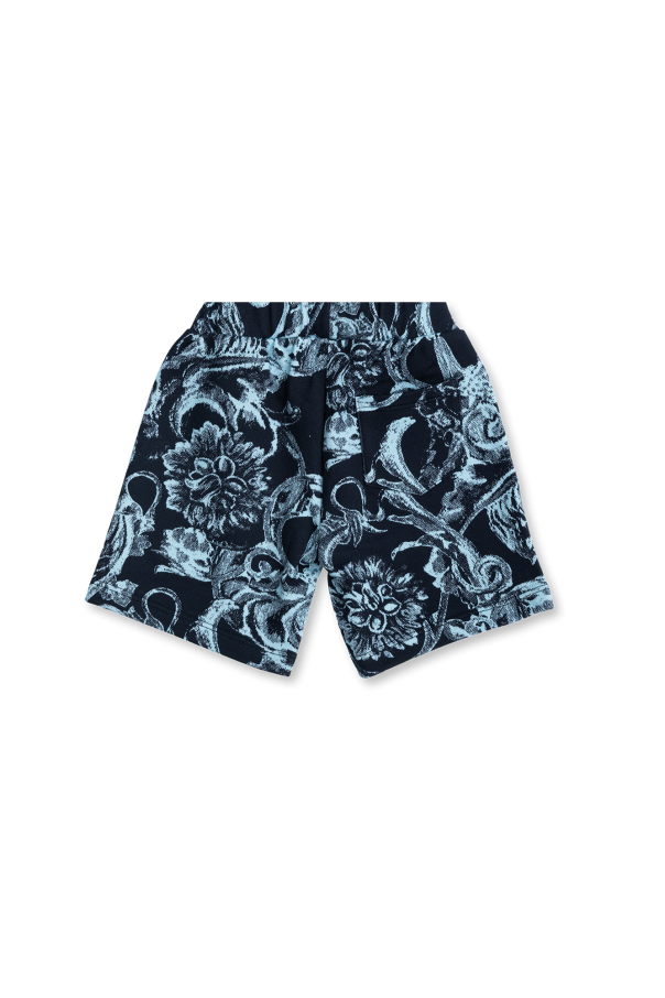 Navy and blue shorts from Versace Kids. Made of cotton, this pair features an elastic drawstring waistband, decorative pattern and slip pocket.
