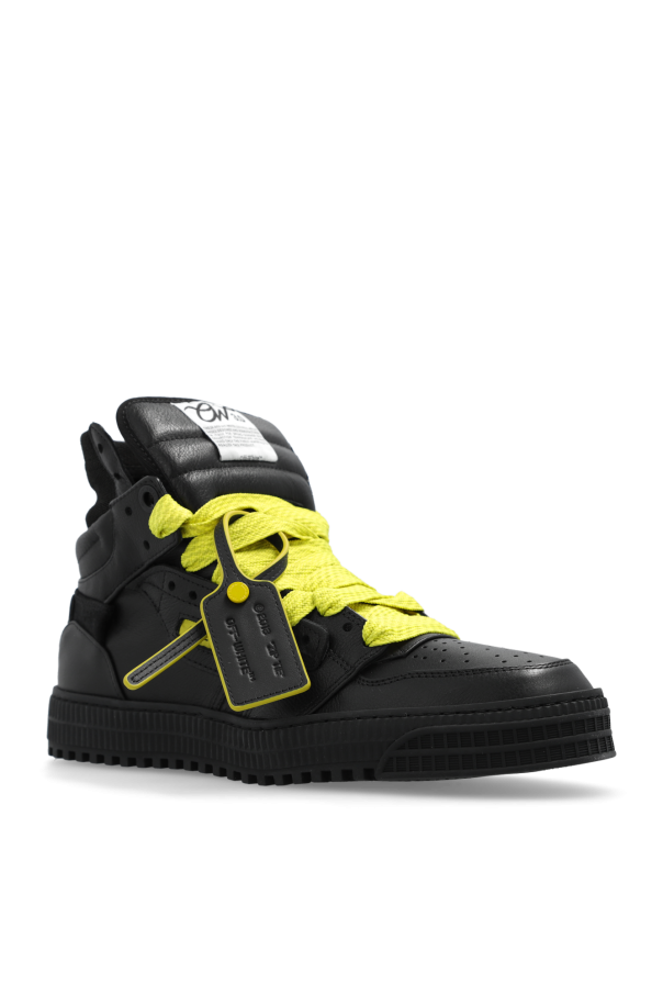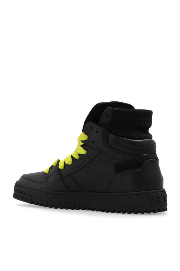 White and green ‘3.0 Off Court’ high-top sneakers from Off-White. Made of leather, this lace-up pair features a patch, embossed logo, decorative tag and black rubber sole.
