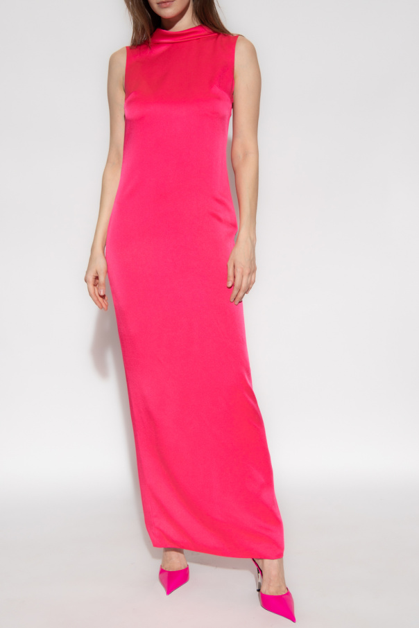 Pink sleeveless dress from Versace. Rendered in satin with a denuded back, this style fastens with a hidden side zipper and employs a back opening and internal tulle briefs features hook & eye closures.