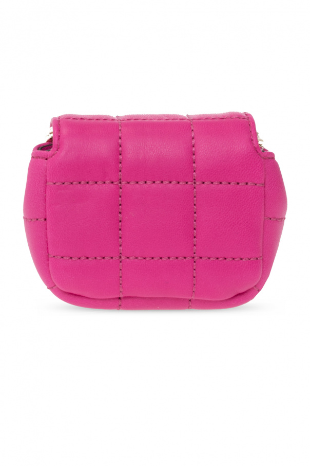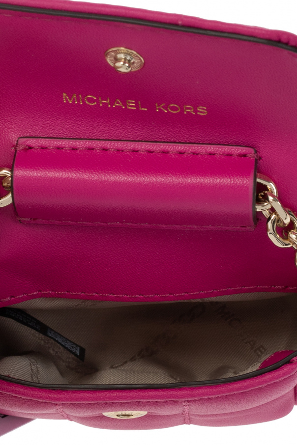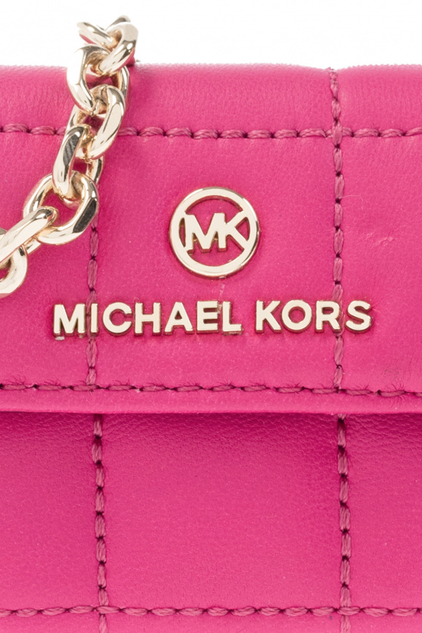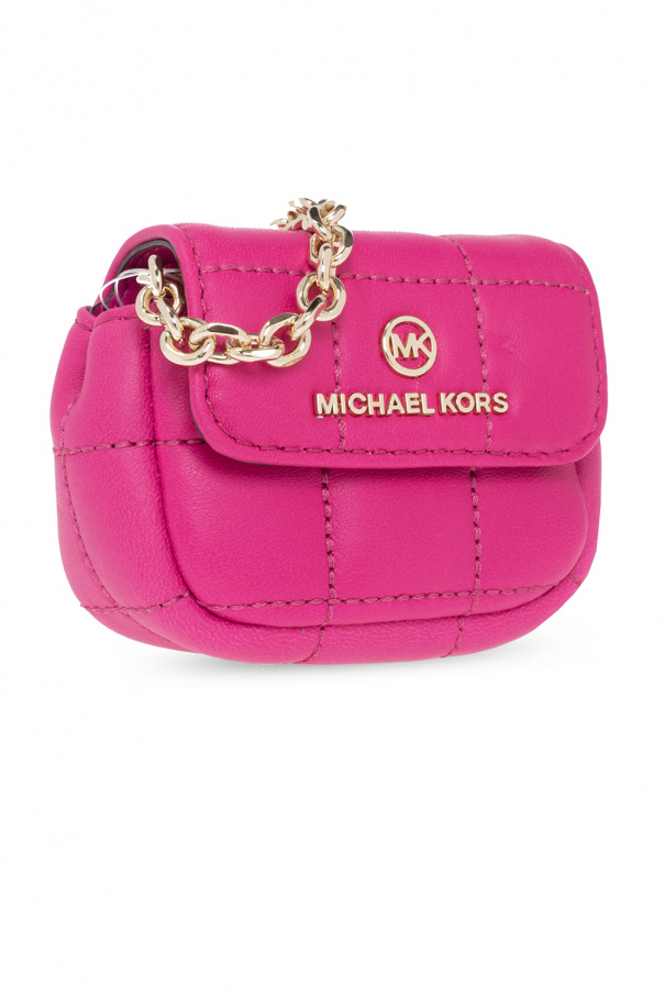 Pink AirPods case from Michael Michael Kors. Made of lamb leather, this design secures with a snap and showcases a metal logo plaque on the front, a chain shoulder strap, gold-tone metal hardware and one internal compartment.
