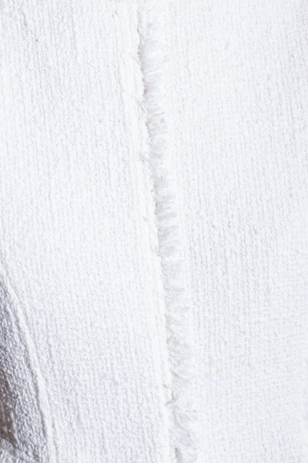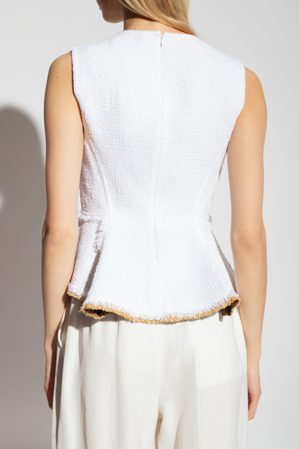 White tweed sleeveless top from Tory Burch. Made of cotton with a tailored fit, this style features a round neck, an asymmetrical basque hem, a hidden back zipper with a hook & eye closure, fringe detailing and a black tulle trim accentuated with red dots.
