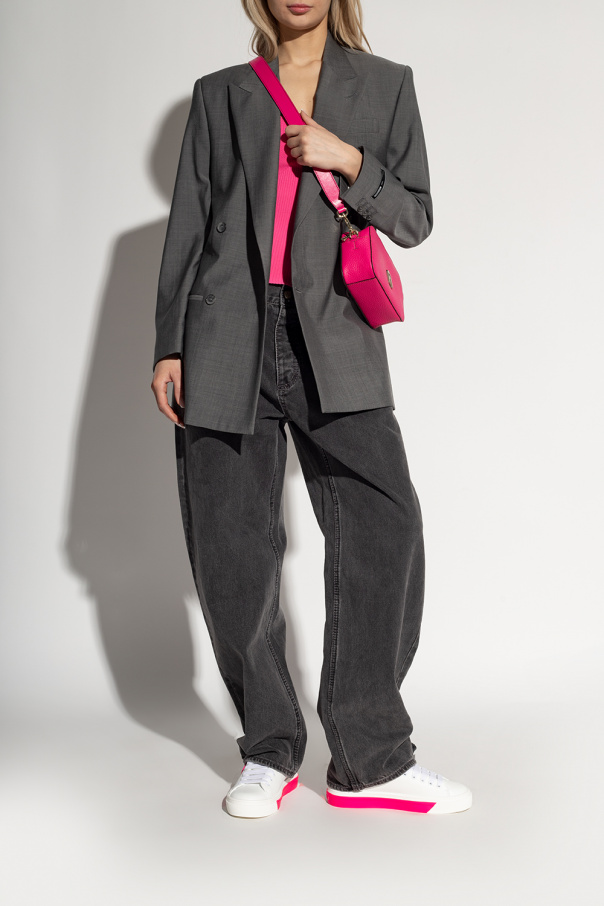 White ‘Binding’ sneakers from Furla. Crafted from leather, this lace-up model sits on a white and neon pink rubber sole and features a light gold-tone logo print and a neon pink heel counter and logo patch.
