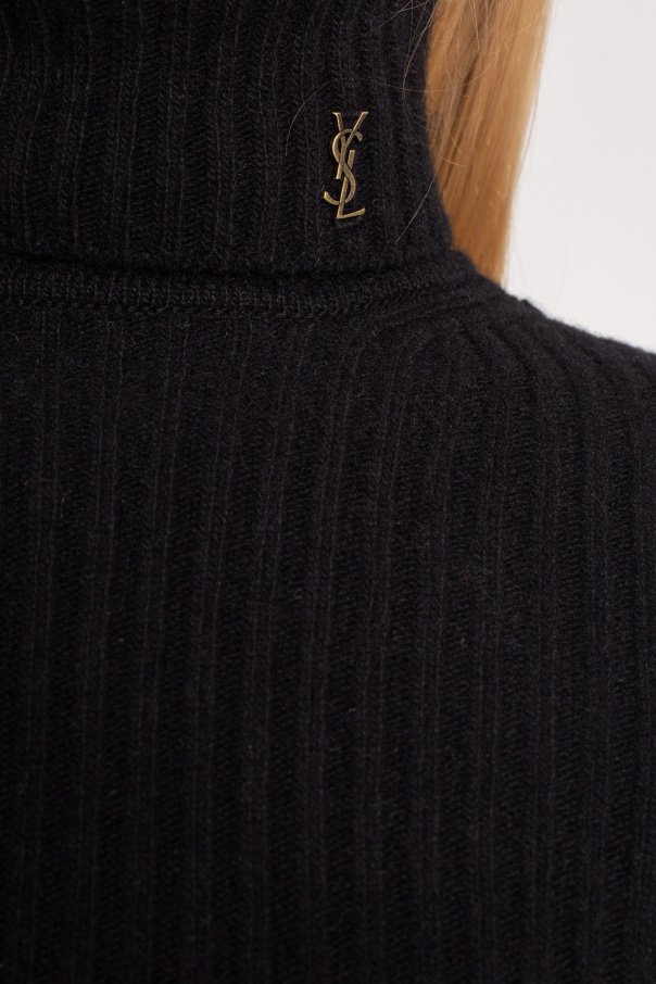 Black turtleneck sweater from Saint Laurent. Knitted from a wool and cashmere blend, this long sleeve design is decorated with a logo appliqué.