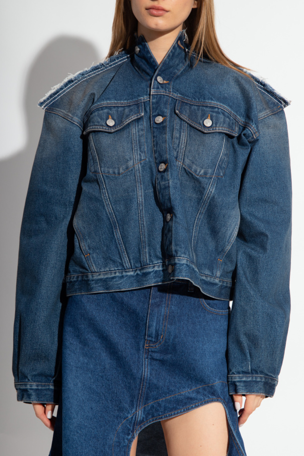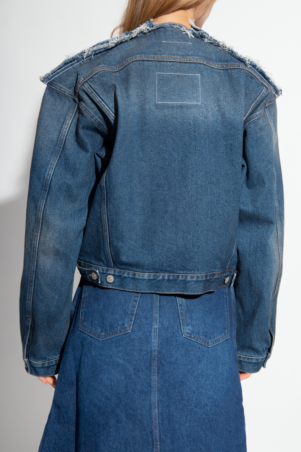 Dark blue collar-less denim jacket from MM6 Maison Margiela. Made of cotton, this style fastens with buttons and showcases decorative raw trimming, distressed detailing, two flapped pockets with buttons, two slip pockets and long sleeves with button cuffs.