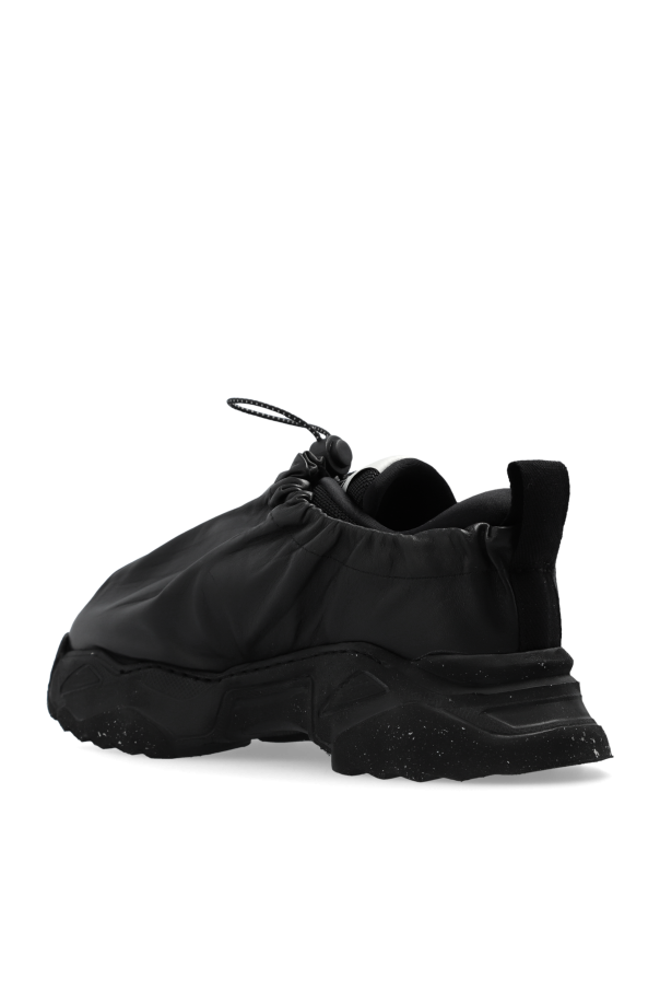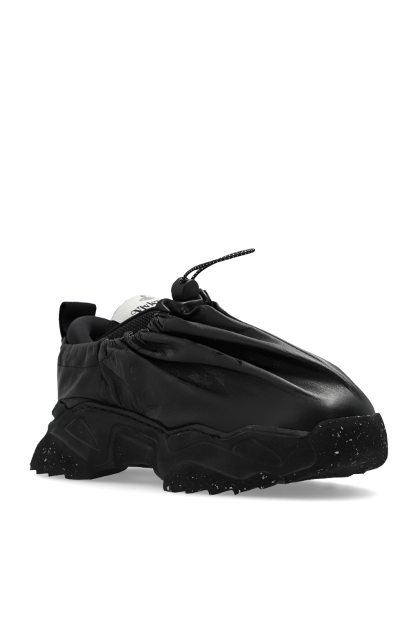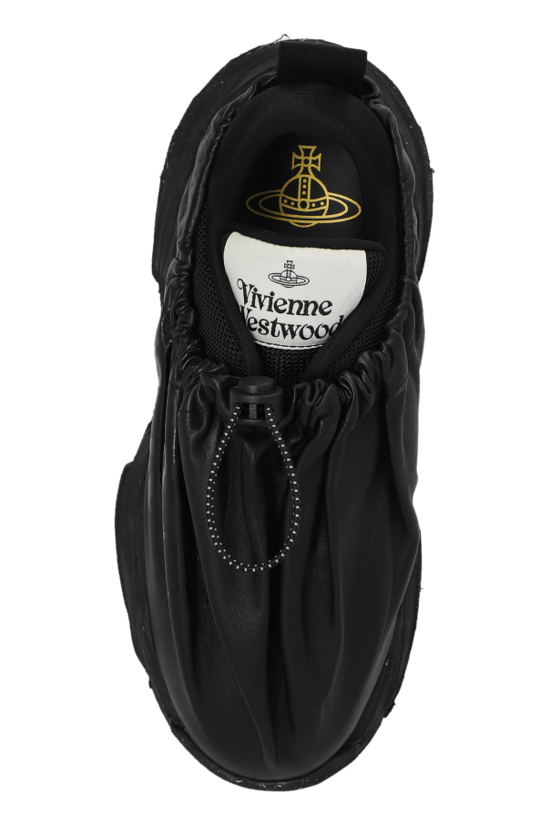Introducing the ‘Romper Bag’ Sport Shoes by the illustrious Vivienne Westwood, a confluence of modern design ethos and the distinctive flair synonymous with high fashion. Crafted with a sleek, shimmering exterior that seductively gathers around the ankles, these shoes are a testament to sophisticated sportiness. The predominant black hue exudes elegance, while the rounded, slip-on silhouette with an elastic upper ensures a blend of comfort and chic. The outer layer, fashioned from premium leather, complements an interior lined with a soft, durable material, ensuring both luxury and longevity. A robust rubber sole, characterized by its exaggerated, avant-garde shapes and textured finish, anchors the design, offering unparalleled durability and grip. The inclusion of adjustable drawstrings at the ankle allows for a personalized fit, further enhancing the utility of these avant-garde sneakers. An interior flaunting the Vivienne Westwood logo not only signifies the designer\'s mark of excellence but also adds an exclusive touch to this exquisite footwear. Why Purchase This Product? Exclusive Vivienne Westwood design, ensuring you possess a piece of high-fashion history. Elevated with a luxurious leather outer layer and a comfortable inner material. Durable rubber sole with a unique, trend-setting design for enhanced grip and longevity. Adjustable for a perfect fit, thanks to the innovative drawstring detail at the ankle. A bold statement in contemporary sporty chic, perfect for those who dare to stand out.