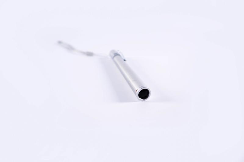 Маленький фонарик имеет металлический корпус со встроенным аккумулятором и