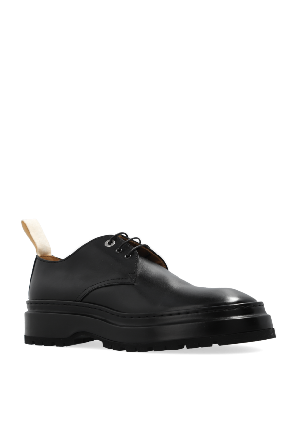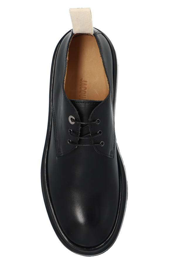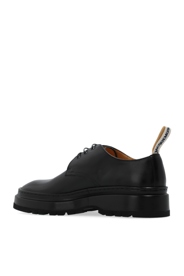 Black ‘Pavane’ Derby shoes from Jacquemus. Made from leather with a round toe, this model sits on a black rubber sole and features a beige pull tab with an embroidered logo on the back.