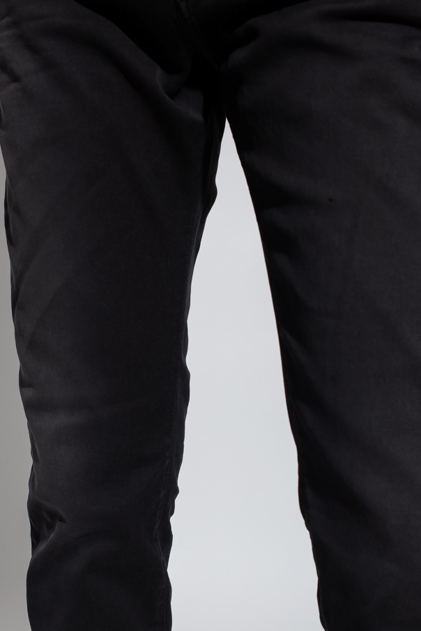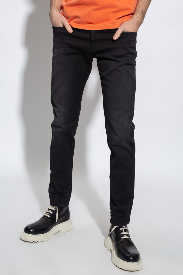 Black \'D-Strukt Jogg\' jeans from Diesel. Falling with tapered legs, this pair features a zip fly with a button, classic five pockets and a logo patch on the front.