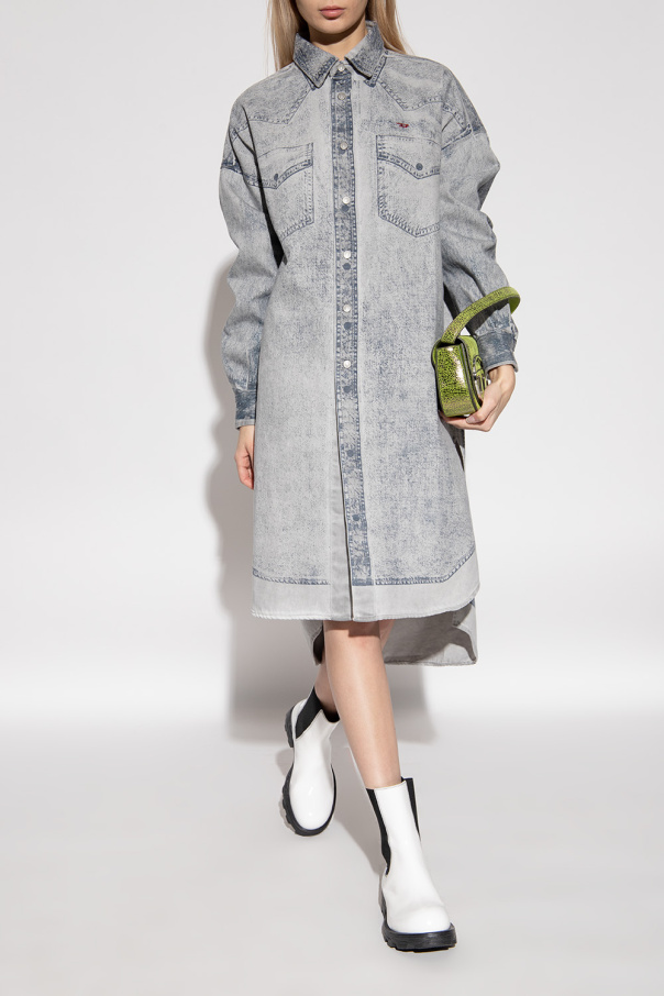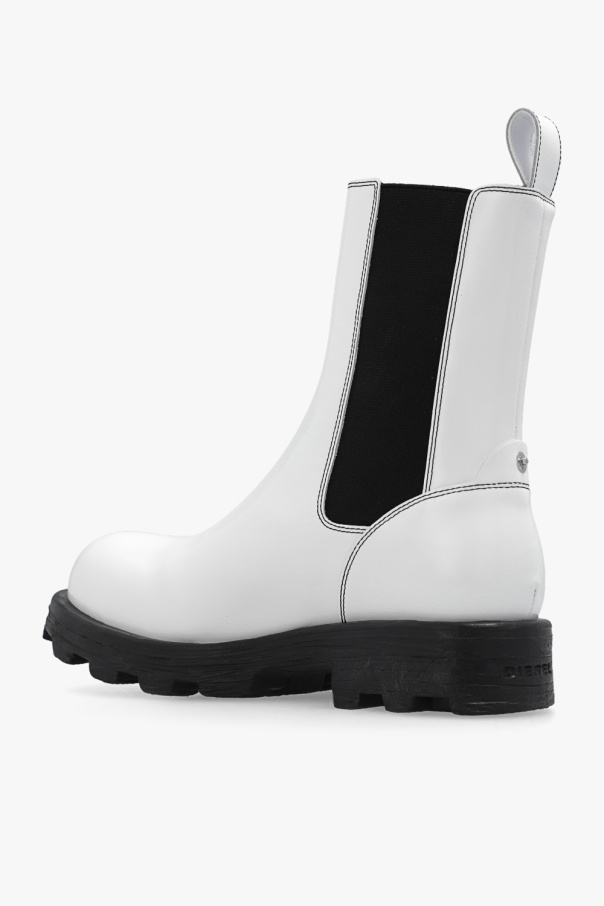 White ‘D-HAMMER’ leather ankle boots from Diesel. Crafted from leather, this model sits on a black rubber sole and features black elastic panels on the sides and a pull tab at the back.