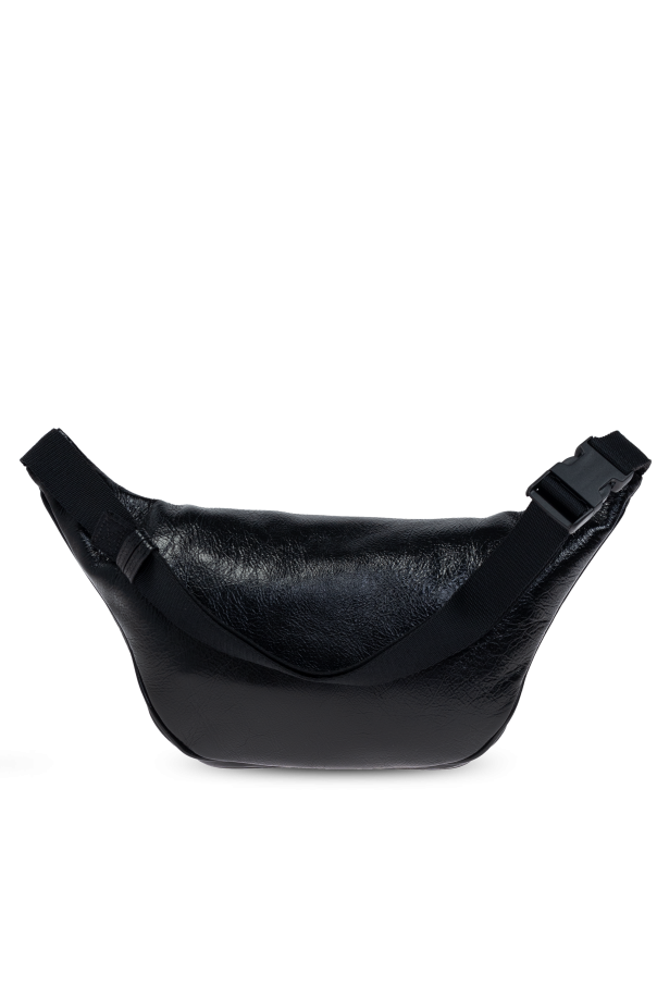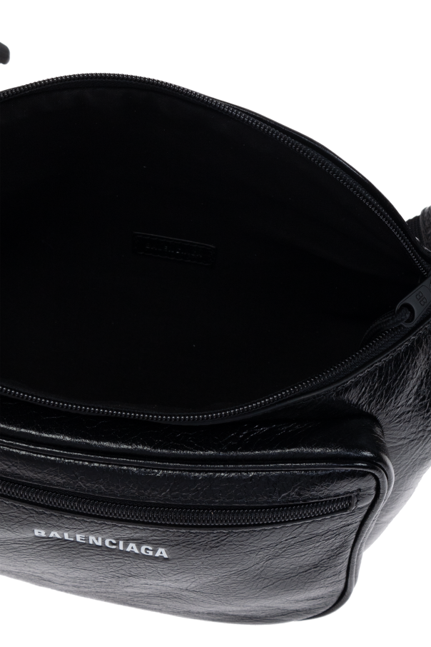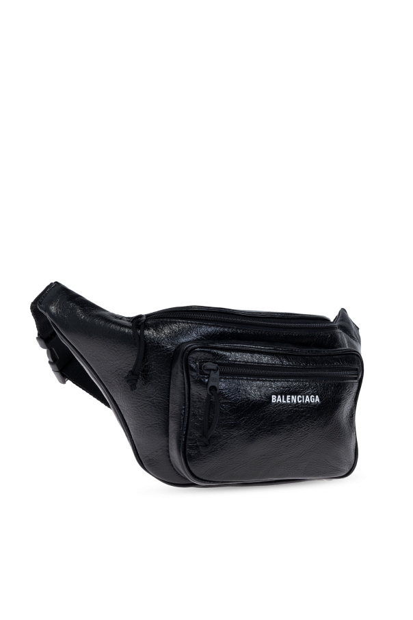 Introducing the epitome of luxury and functionality - the \'Explorer\' belt bag by the illustrious Balenciaga. Crafted with precision, this accessory exudes sophistication with its sleek, rectangular silhouette, gracefully rounded edges, and a sumptuously textured black sheep leather exterior. The bag\'s facade is adorned with the iconic Balenciaga logo in bold white, immediately signifying its high-end pedigree. The \'Explorer\' is ingeniously designed with a spacious main compartment and an additional external pocket, both secured with zippers, ensuring your essentials are safely stowed yet easily accessible. Its resilient material composition promises enduring quality and resistance to the rigors of daily use. The adjustable strap, finished with metal clasps, offers versatile wearability, allowing the bag to be styled around the waist or across the body for a contemporary look. Its universal black hue renders it an impeccable match for an array of ensembles, making it not just a practical addition to your wardrobe but a statement of prestige and style. Why Purchase This Product? Iconic Balenciaga branding elevates your accessory game. Luxurious sheep leather and durable material construction. Functional design with secured compartments for organized storage. Adjustable and versatile strap for varied styling options. Universal black color for effortless pairing with any outfit.
