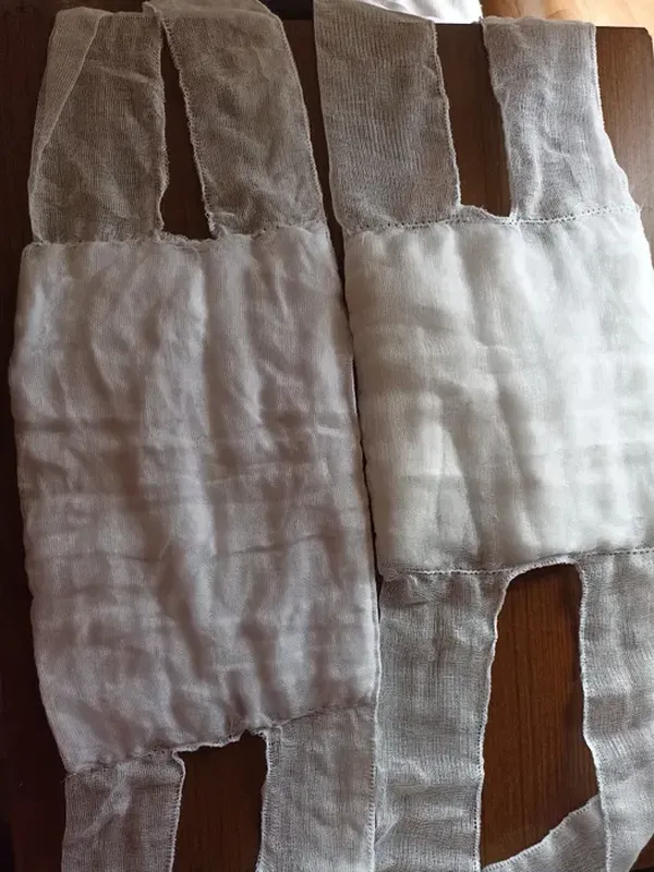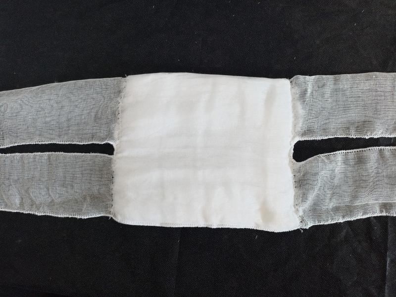 На пов'язку по нормам іде марлі 90*50см, та вати 20*20 товшиною в 1.5 см, широкі зав'язки.Размір 20на20 см ціна 35рн.