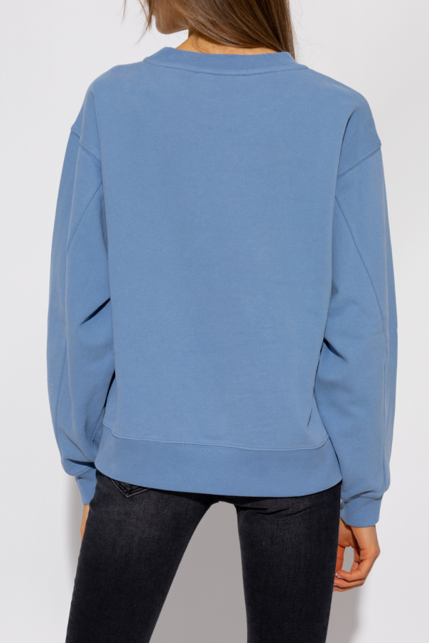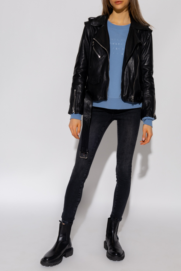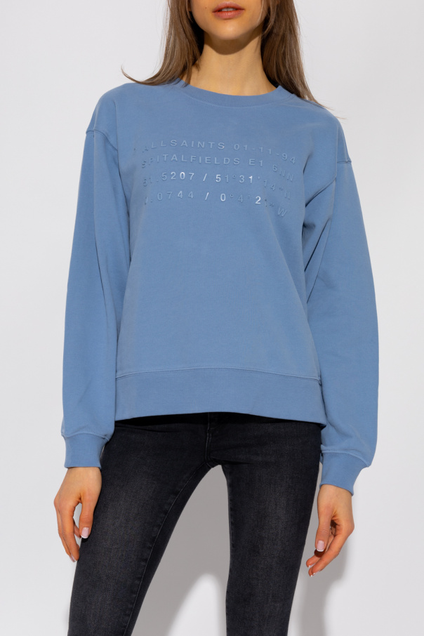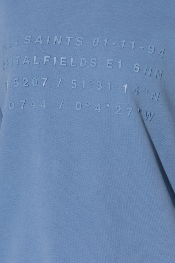 Blue ‘Address Demi’ sweatshirt from AllSaints. Crafted from cotton, this garment features geographic coordinates of the label’s Head Office in London and ribbed trims at the crew neck, hem and cuffs.