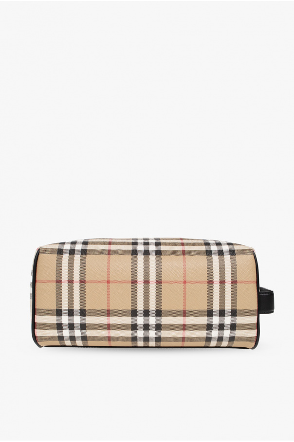 Beige wash bag from Burberry. Crafted from cotton canvas with leather trims, this model features a zip fastening, the brand’s signature multicolored check pattern, leather handle on the side and one internal compartment with two slip pockets and one zip pocket