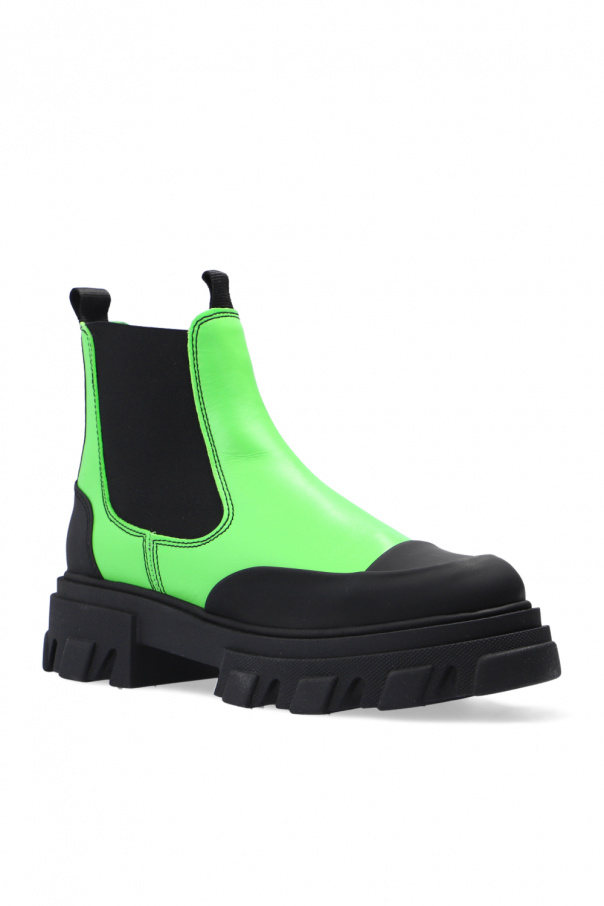 Green Chelsea boots from Ganni. Crafted from leather and rubber, this model sits on a black rubber sole and features elastic panels on the sides and a black logo on the back.