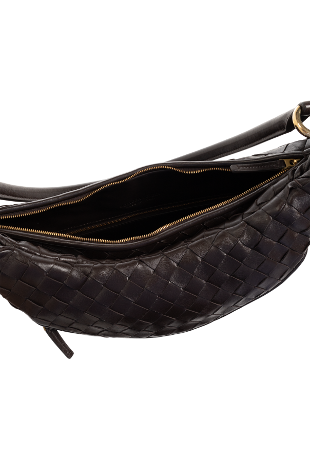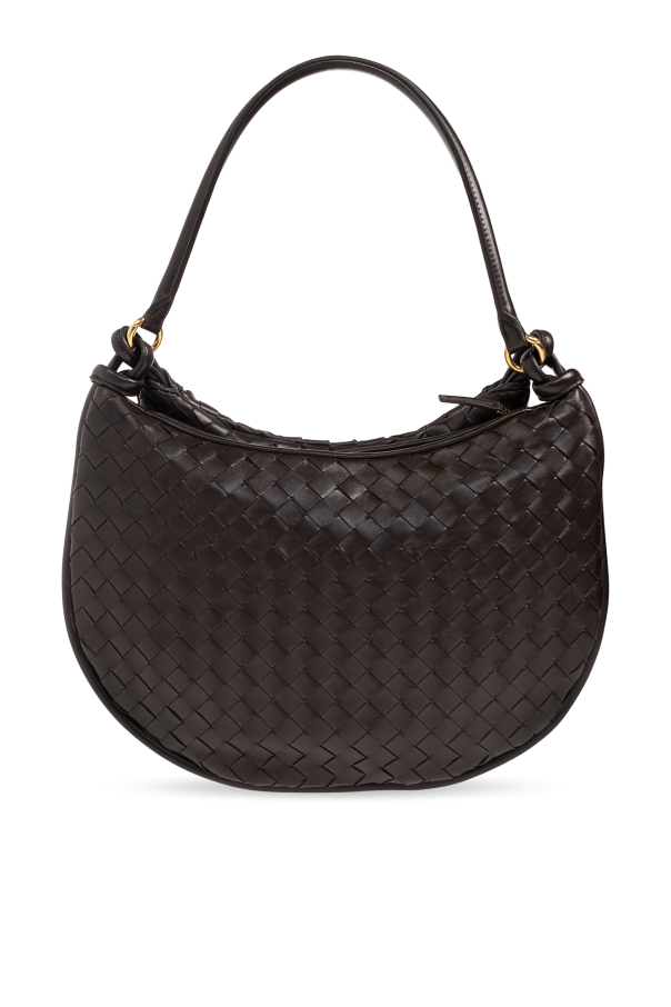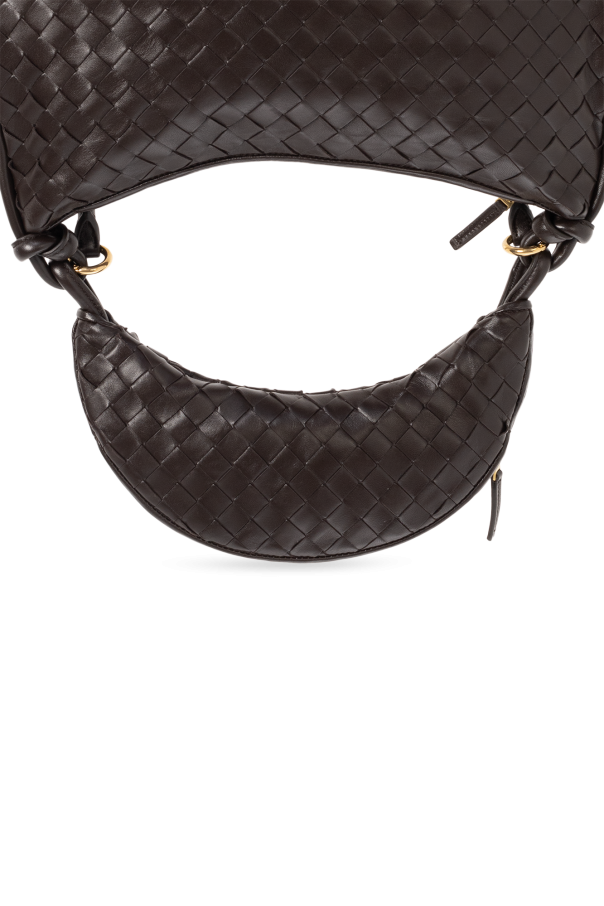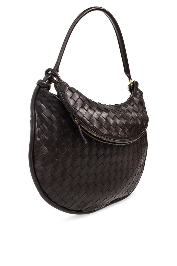 Brown ‘Gemelli Large’ shoulder bag from Bottega Veneta. Crafted from lamb leather with the brand’s signature Intrecciato weave, this design features a zip fastening, shoulder strap, additional half-moon zipped handle in Intrecciato leather, gold-tone metal hardware and one internal compartment with one zip pocket.