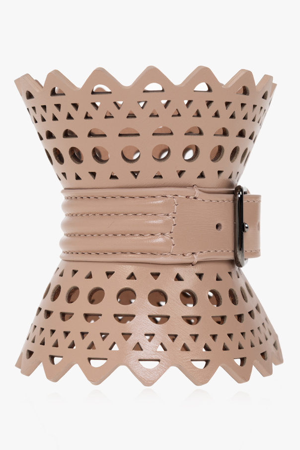 Cream and beige bracelet from Alaia. Made of calf leather, this design fastens with a buckle strap and is decorated with the Vienne pattern inspired by precious lace and moucharabieh architectural openwork.