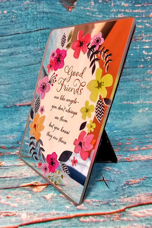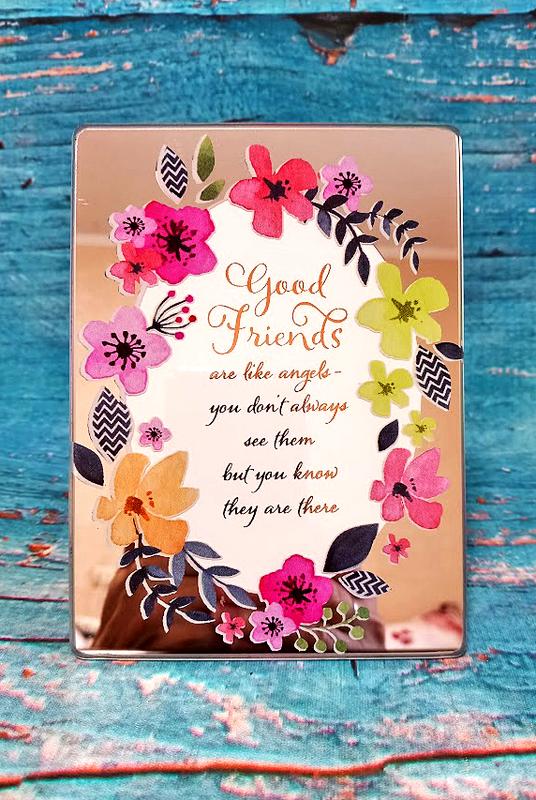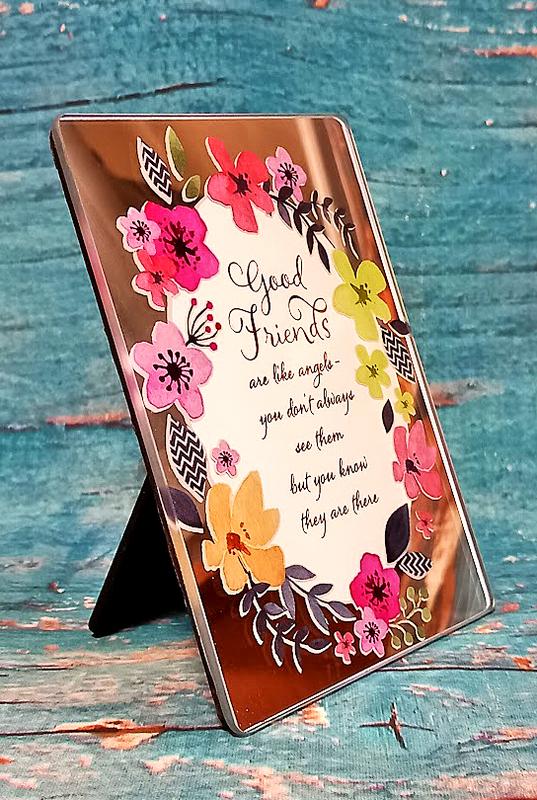 Замечательный подарок для подруги, друзьям зеркальная рамочка с нанесённый цветами и душевной надписью в переводе " Хорошие друзья подобны ангелам: ты не всегда их видишь, но знаешь, что они есть" в обрамлении цветов