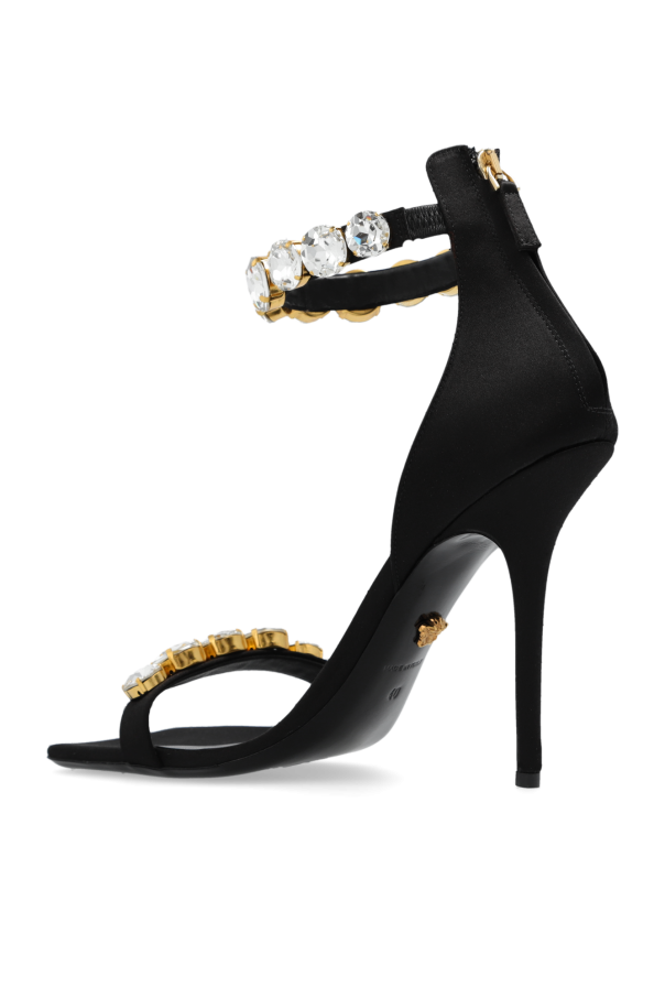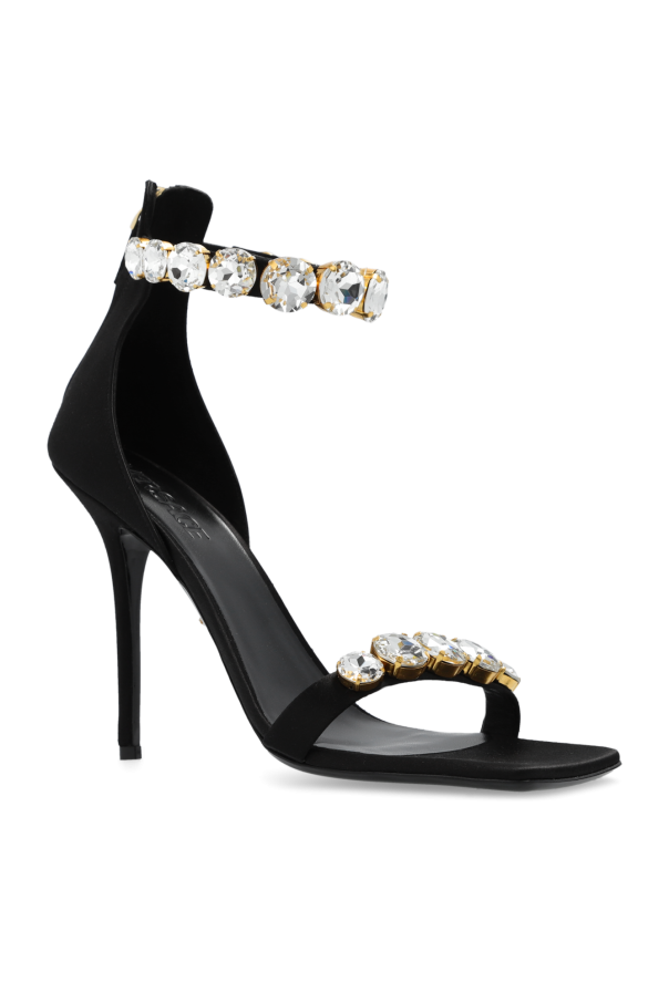 Black heeled sandals from Versace. Made of satin, this pair features a zip fastening at the back, gold-tone detail embellished with crystals and black leather sole.