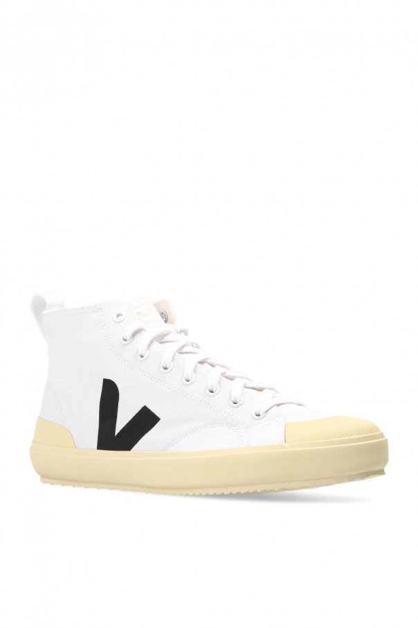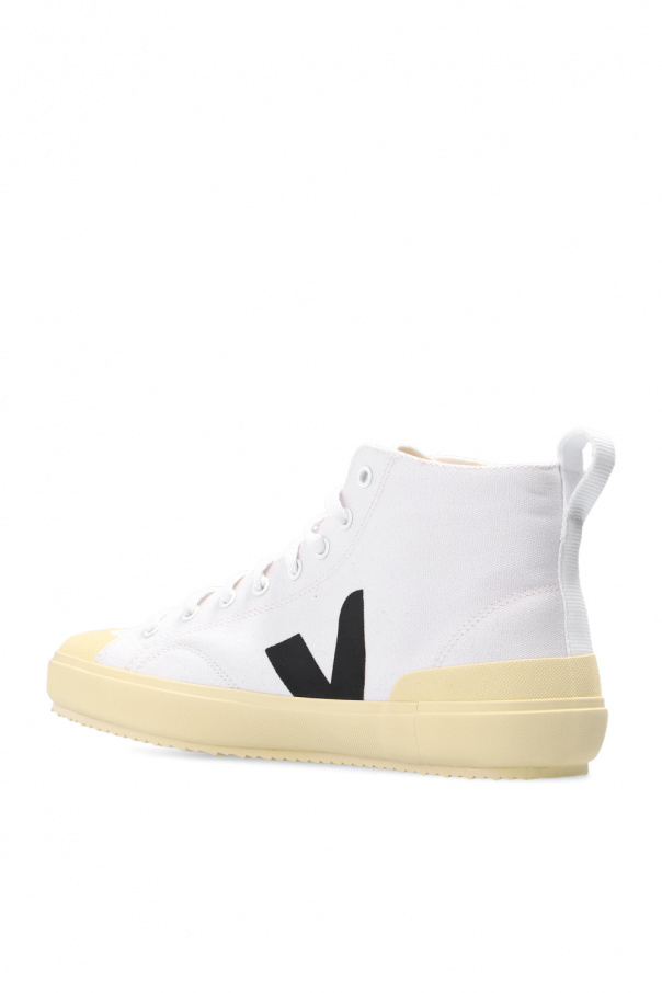White ‘Nova HT’ high-top sneakers from Veja. Crafted from organic cotton, this lace-up design is decorated with a cream logo print and silver-tone metal hardware. The insole is produced from wild rubber, sugar cane, Amazon rubber, organic cotton and recycled EVA. It is set on a cream rubber sole made from organic and recycled materials.