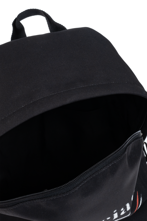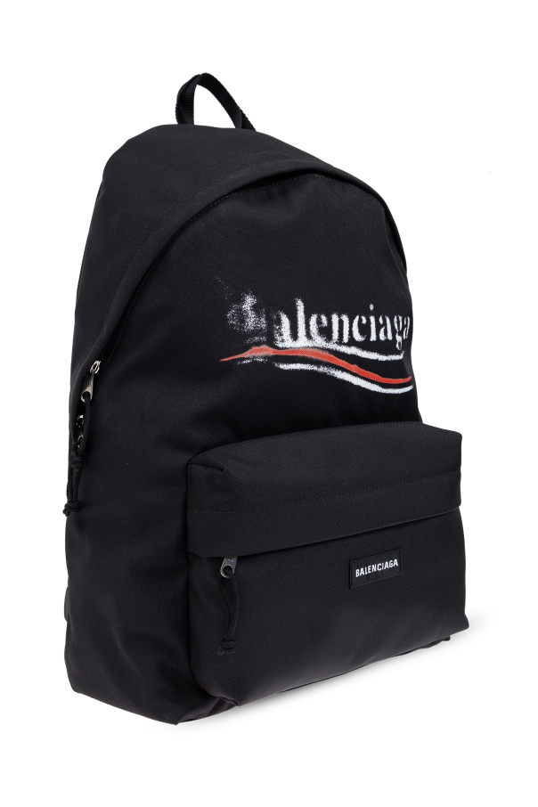 Introducing the ‘Explorer’ Backpack by Balenciaga, a paragon of refined functionality and sleek aesthetics. Crafted from high-grade, densely woven synthetic material, possibly nylon, this backpack stands as a testament to durability and weather resistance. Its elegant black hue is punctuated by a distinctive white logo above a red and white stripe on the front, imbuing it with a signature look that is both sophisticated and instantly recognizable. The Explorer is designed with a classic, rectangular shape with softly rounded top corners, ensuring a timeless appeal. An external front pocket, secured with a zipper, enhances its practicality, while the main compartment boasts a spacious, single-chamber interior with an additional zippered pocket, perfect for organizing essentials. Dual-zip closure ensures everything stays secure, whether you\'re navigating urban jungles or embarking on outdoor adventures. Comfort is paramount with the Explorer. Adjustable, padded shoulder straps promise an ergonomic fit, making it ideal for extended wear. A top handle offers an alternative carrying option, adding to its versatility. The backpack\'s proportions are perfectly balanced, ensuring it complements the wearer without overwhelming, as evidenced in lifestyle imagery. Why Purchase the ‘Explorer’ Backpack? Durable Material: High-quality, weather-resistant fabric ensures longevity and protection of your belongings. Signature Design: The unique Balenciaga logo and color scheme make it a standout piece. Functional Elegance: Ample storage, including a secure zippered inner pocket, meets sleek design. Comfortable Wear: Ergonomically designed straps and versatile carrying options cater to all-day use.