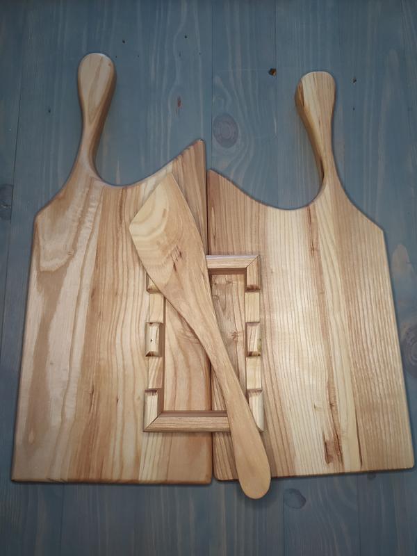 набор входит 2 доски, лопатка и подставка. Доски сделаны из ясеня. Размеры