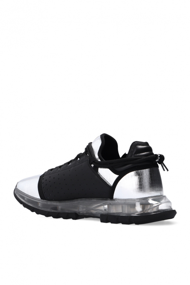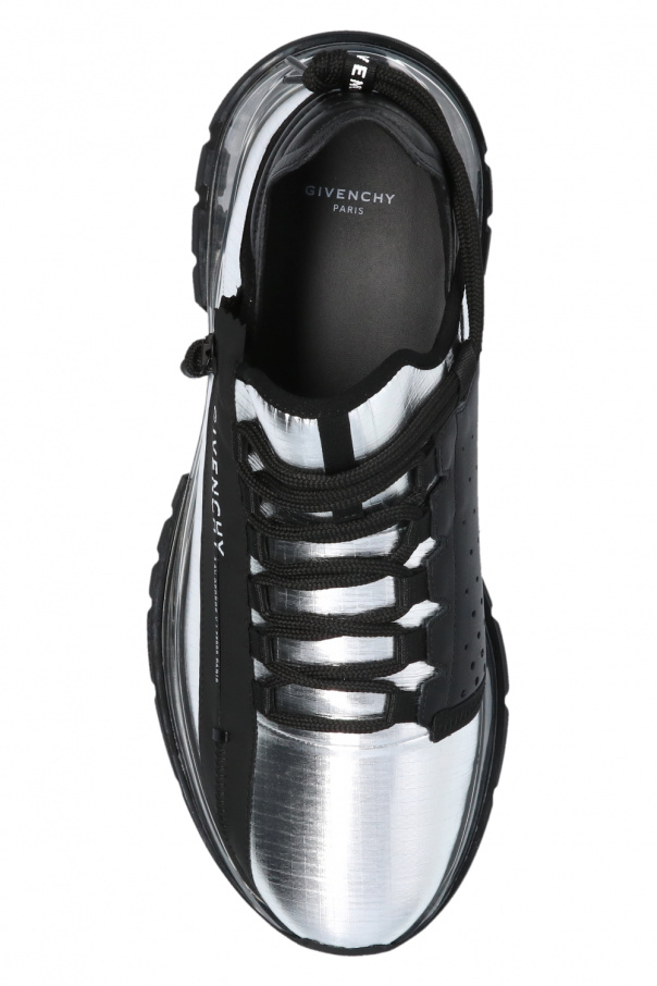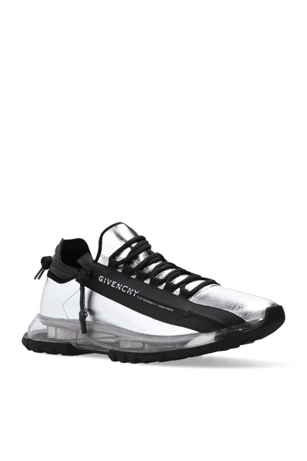 Black and silver-tone ‘Spectre’ sneakers from Givenchy. Made of leather and fabric, this lace-up design features a decorative zip closure printed with a white logo and a black rubber sole.