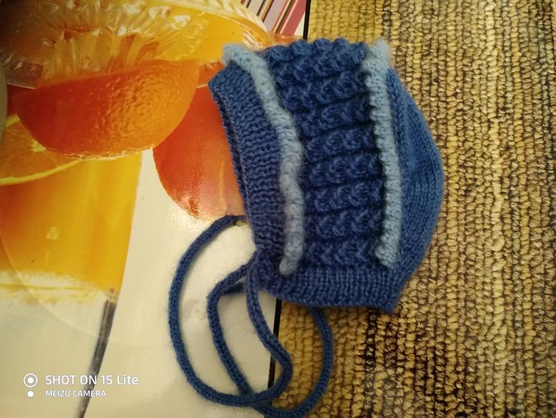Шапочка для мальчика связана спицами без швов. Пряжа мохер.Шнурочки для завязок.