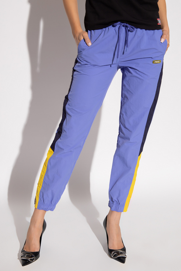 Blueish purple 'AWWB-SWEANG-HT25' track pants from Diesel, the 'Sport 55DSL' collection. Accentuated with yellow and navy blue side panels, this pair features a drawstring waistband, logo patches on the front and back, two slip pockets and elasticated cuffs with zip vents.