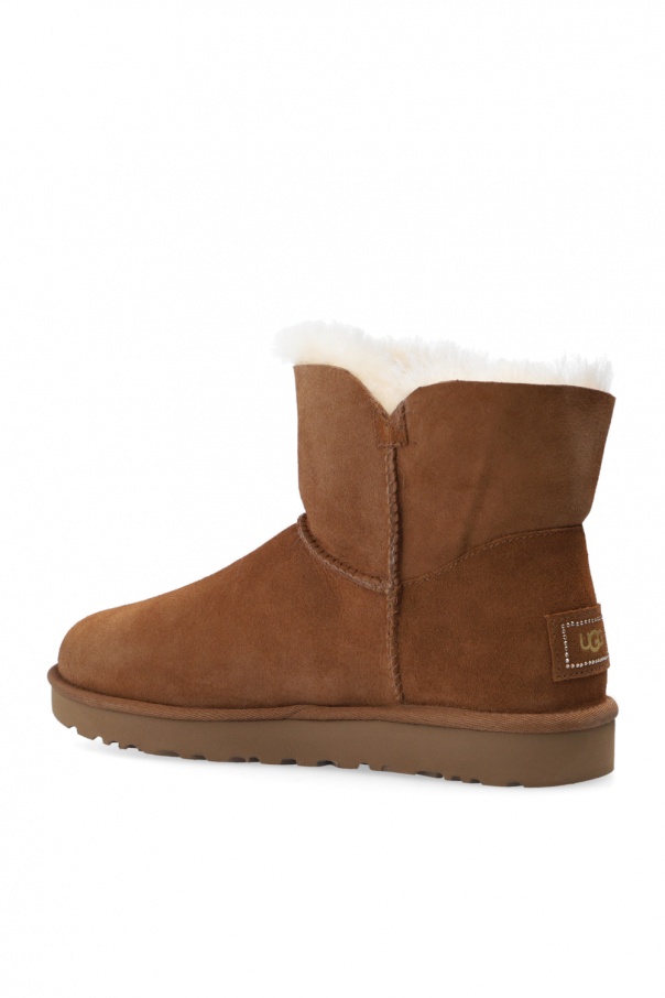 Light brown \'W Mini Bailey Button Bling\' snow boots from UGG. Crafted from suede, this pair is set on a lightweight and flexible beige sole in EVA foam and features cream wool lining, gold-tone logoed button closing on the side, distinctive stitching details as well as gold-tone Swarovski crystals-encrusted logo patch on the heel for the brand recognition.