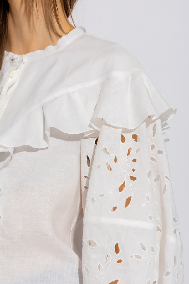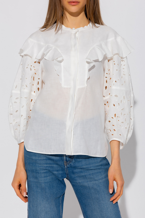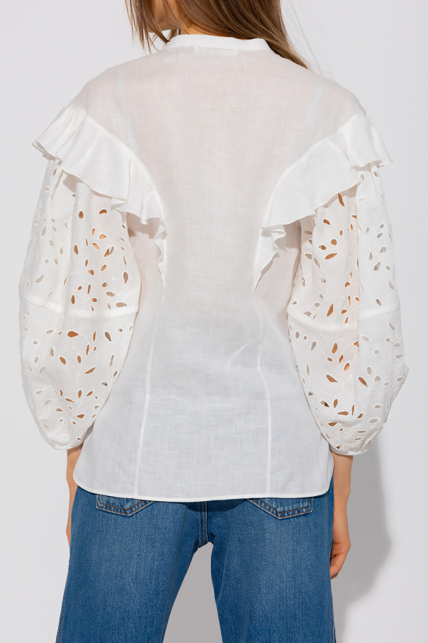 White loose-fitting shirt from Chloé. Made of linen, this loose-fitting design features button fastenings with a concealed placket, ruffles, round neck and long puff sleeves with broderie anglaise.