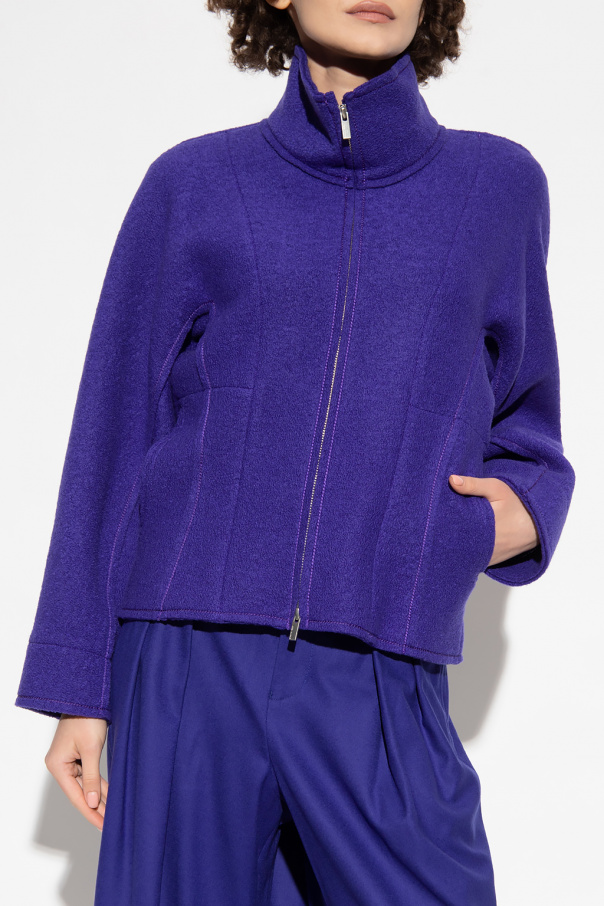 Purple jacket with a collar from Issey Miyake. Crafted from wool, this style features a two-way zip fastening, two frontal pockets and long sleeves.