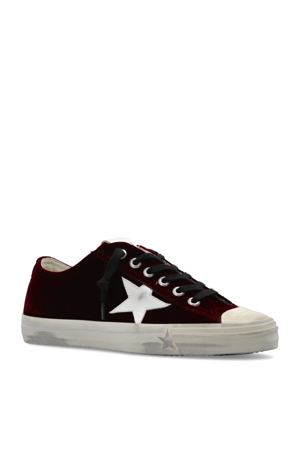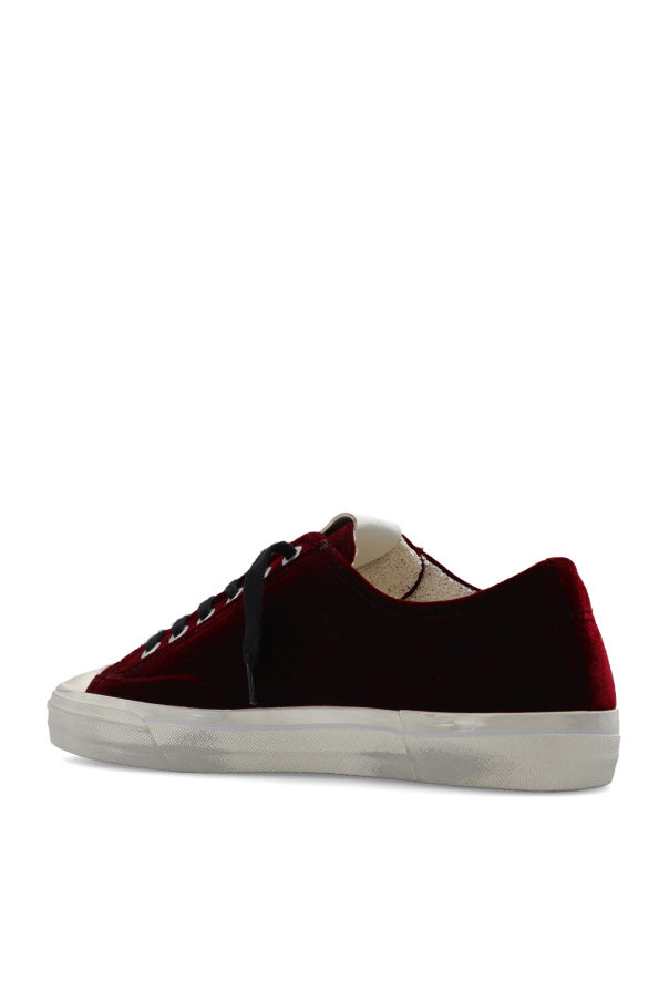 Maroon ‘V-Star 2’ velour sneakers from Golden Goose. Crafted from leather, this lace-up pair features the brand’s signature star patch in white, gold-tone print, vintage effect and rubber sole in black and beige.