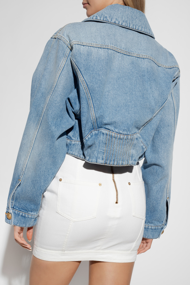 Light blue cropped denim jacket from Balmain. Fastened with decorative gold-tone buttons with the brand’s signature lion head, this design features a metal logo-engraved detail, two slip pockets, two buttoned pockets, elasticated hem and long oversize sleeves with buttoned cuffs.
