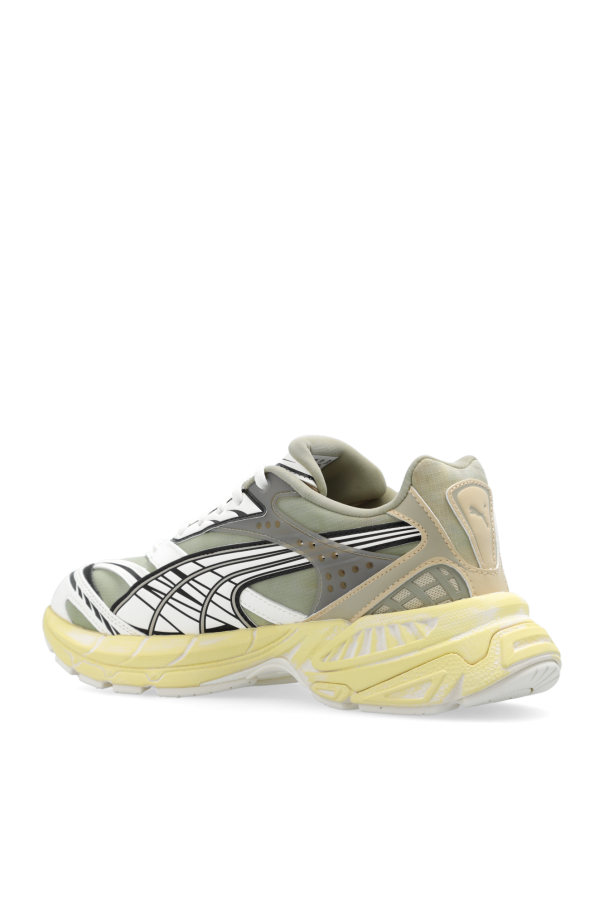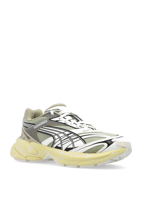 White, black and greenish-grey ‘Velophasis Overdye’ sneakers from Puma x Pleasures. Embellished with the brand\'s logo, this lace-up model sits on a cream and light yellow rubber sole.
