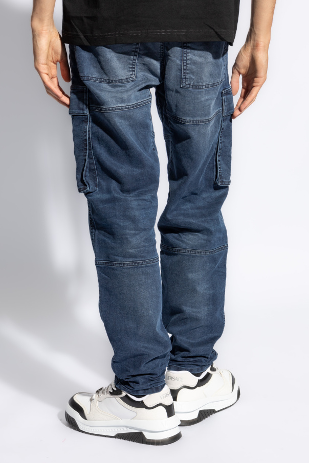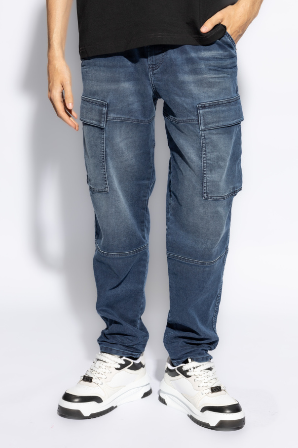 Introducing the epitome of modern denim craftsmanship, the \'2050 D-KROOLEY-CARGO\' jeans by Diesel. These trousers are a testament to the fusion of rugged durability and sleek design, tailored for the contemporary wardrobe. Crafted from a premium blend of 52% Lyocell, 45% Cotton, and 3% Elastan, this pair offers an unparalleled combination of comfort and flexibility. Distinct in style, the jeans feature a tapered fit that gracefully contours the legs, while the varied shades of navy achieved through a meticulous distressing process lend a vintage allure. The inclusion of multiple pockets, including two signature cargo pockets on the thighs, not only enhances functionality but also adds a utilitarian charm to the overall aesthetic. Moreover, the adjustable drawstring waistband injects a casual, sporty vibe, making these jeans a versatile addition to any ensemble. Every detail, from the robust stitching to the locally worn areas, is thoughtfully designed to elevate the garment\'s character. The authentic Diesel brand label, prominently stitched into the seam, serves as a hallmark of quality and originality. Why Purchase This Product? Versatile Design: Perfect for both casual and semi-formal occasions. High-Quality Material: Crafted from a durable and stretchy fabric blend for ultimate comfort and longevity. Functional Pockets: Equipped with seven pockets, including two flap pockets, for ample storage. Unique Aesthetic: The vintage-inspired distressed look with a modern twist. Authenticity: Signature Diesel branding ensures a genuine product.