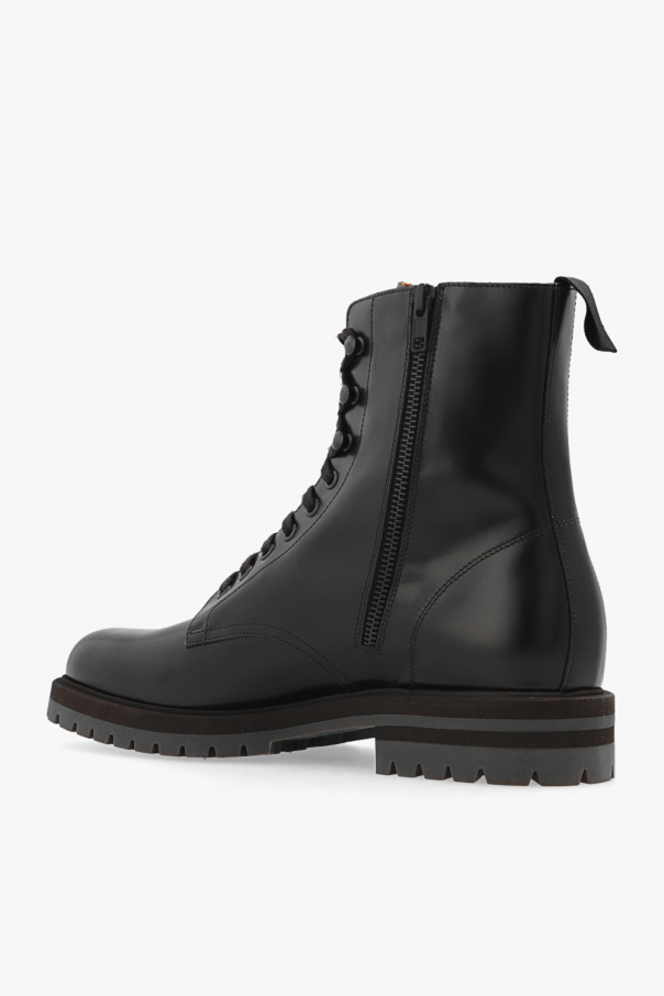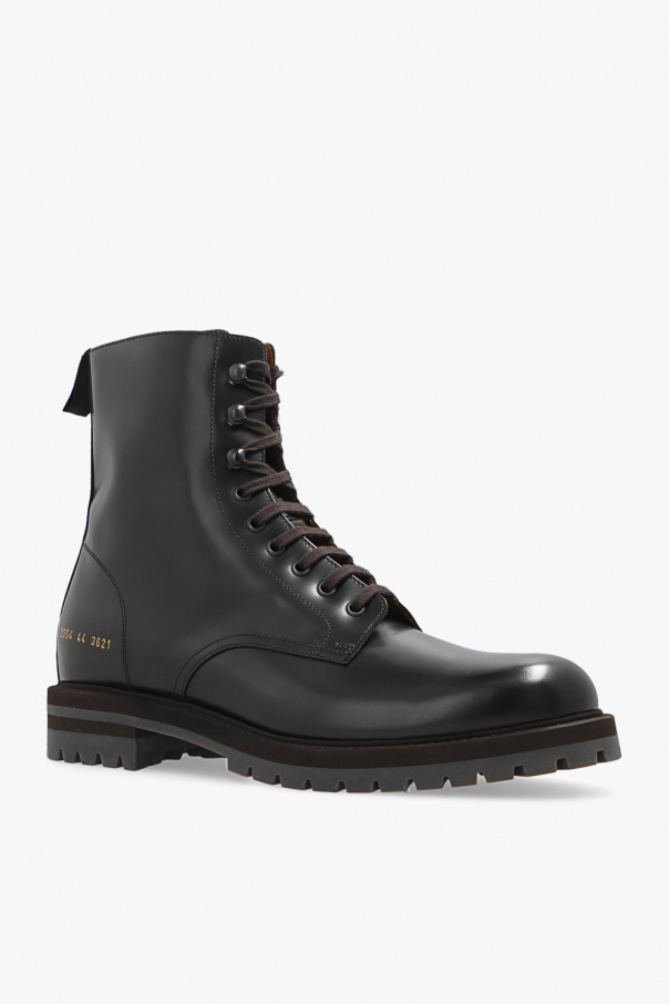 Dark brown combat boots from Common Projects. Made of leather, this lace-up pair is complete with a side zip, gold-tone print and rubber sole in grey and brown.