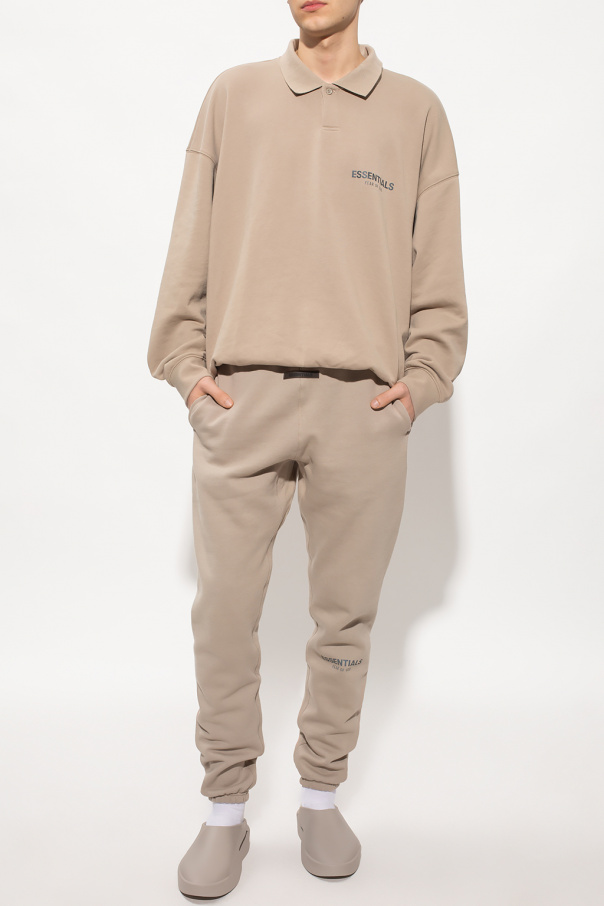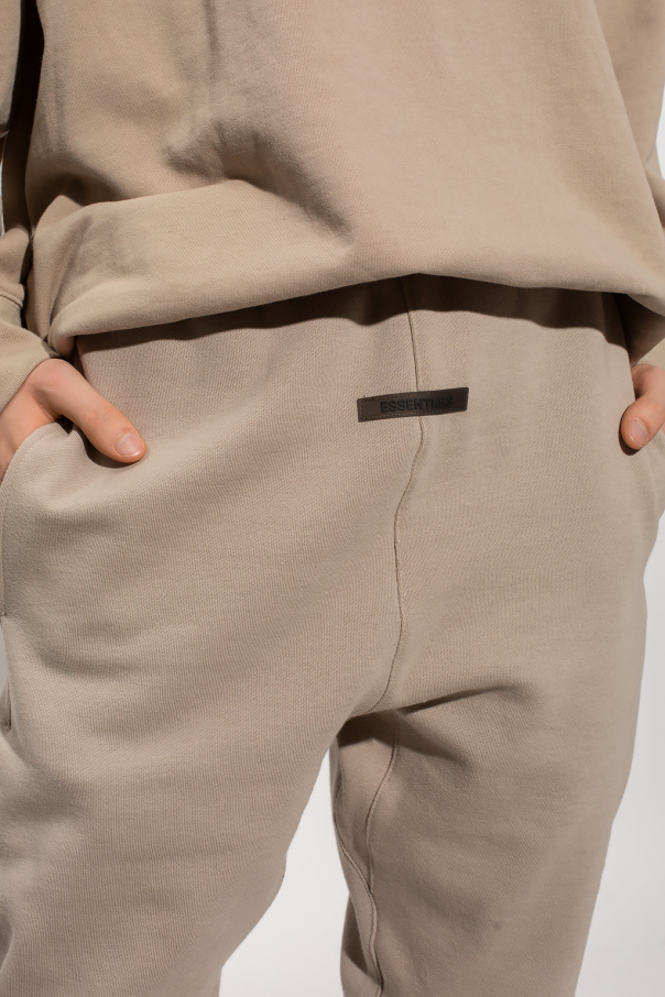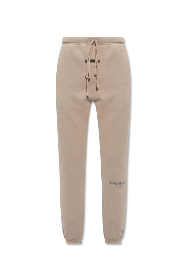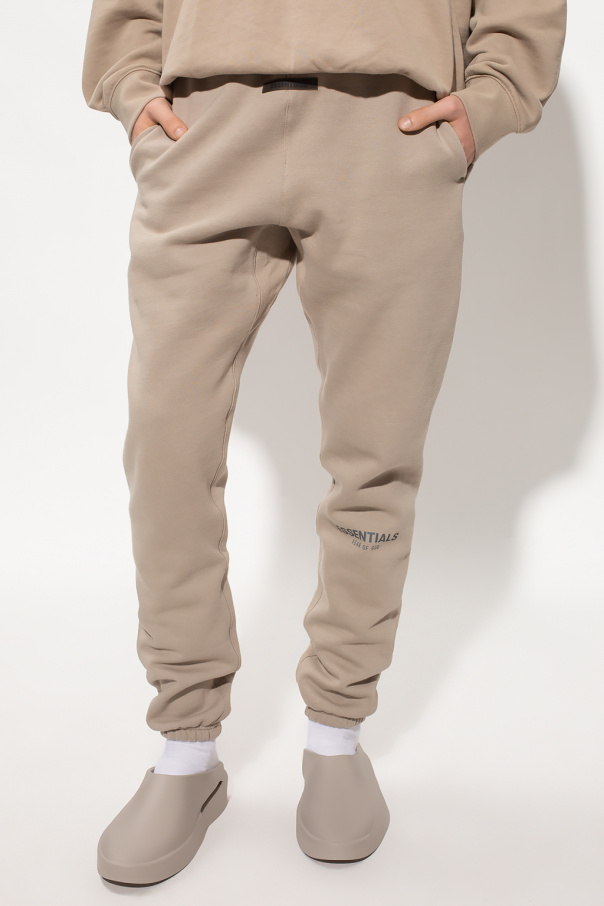 Beige and grey sweatpants from Fear Of God Essentials. Made of cotton, this pair features a drawstring waistband, elasticated cuffs, a patch, a dark grey graphic print with the brand's logo, two slip pockets and slightly tapered legs.
