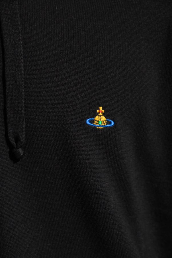 Black sweater with a drawstring hood from Vivienne Westwood. Made of wool, this style showcases an embroidered logo pattern, long sleeves and ribbed trims on the bottom hem and cuffs.