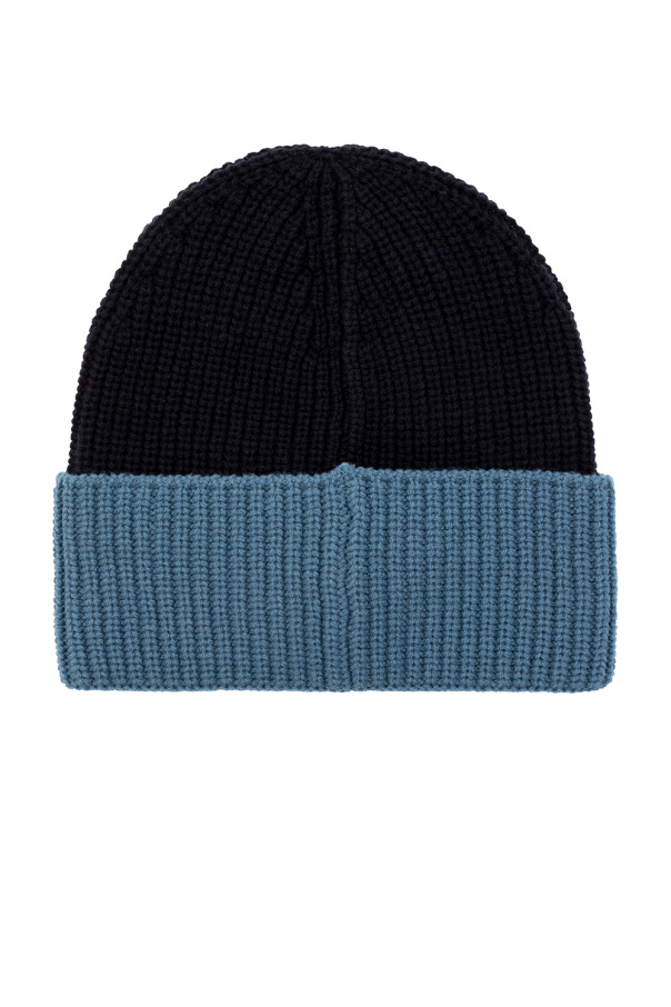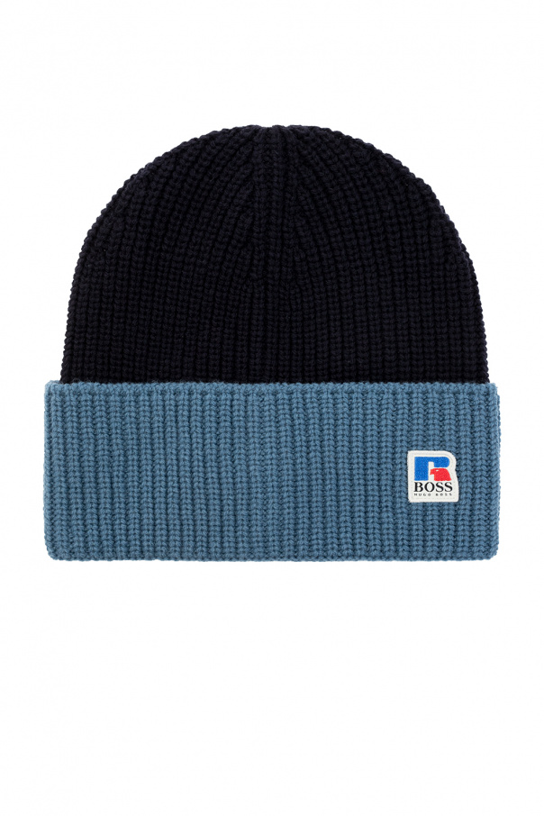 Black and blue hat from BOSS x Russell Athletic. Crafted from wool in a rib-knit design, this item showcases a white patch with a black, blue and orange logo on the front.