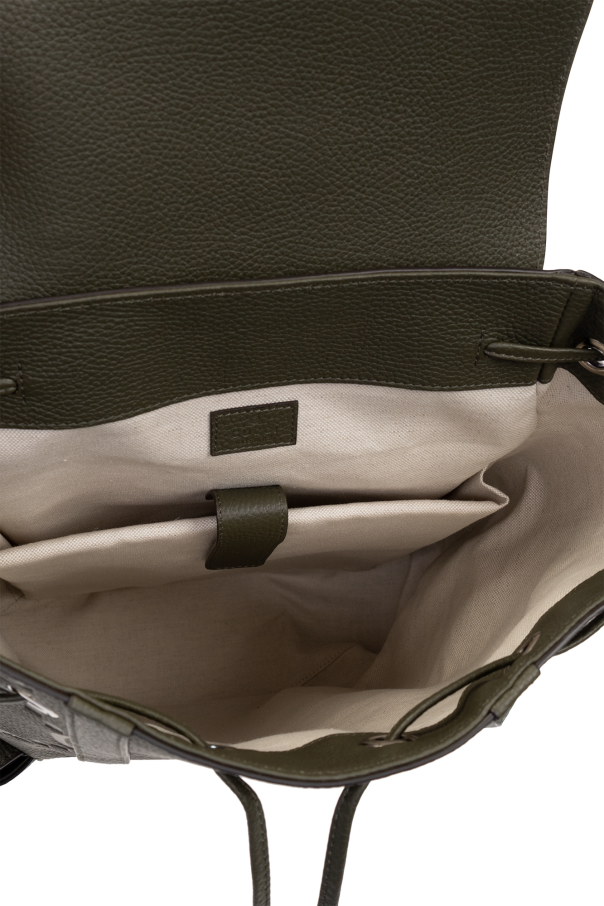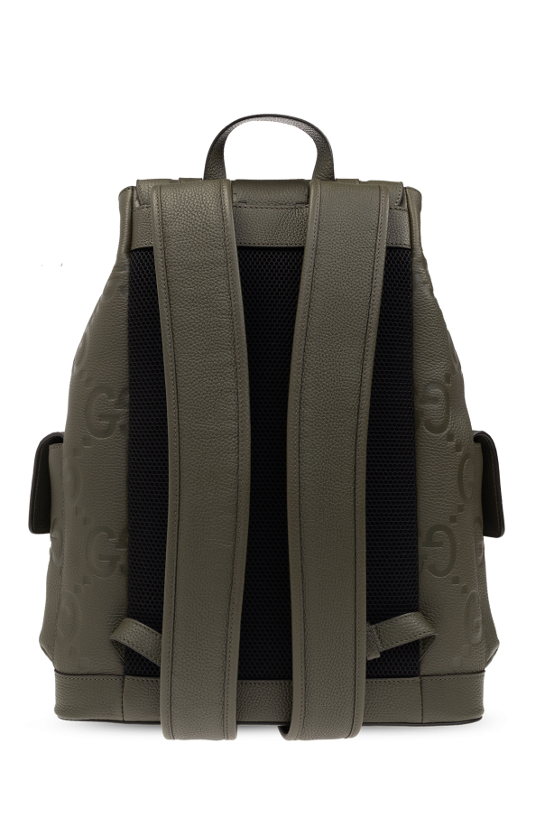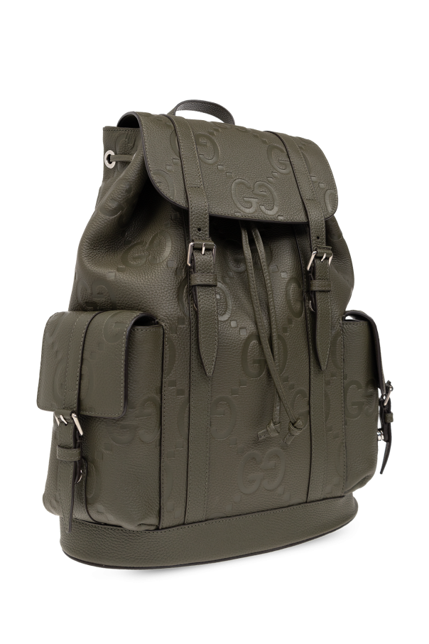 Dark green backpack from Gucci. Crafted from calf leather, this design fastens with a magnetic fastener with a flap and showcases an embossed logo. It is complete with a half-round handle, adjustable shoulder straps, silver-tone metal hardware and one internal compartment with a slip pocket.