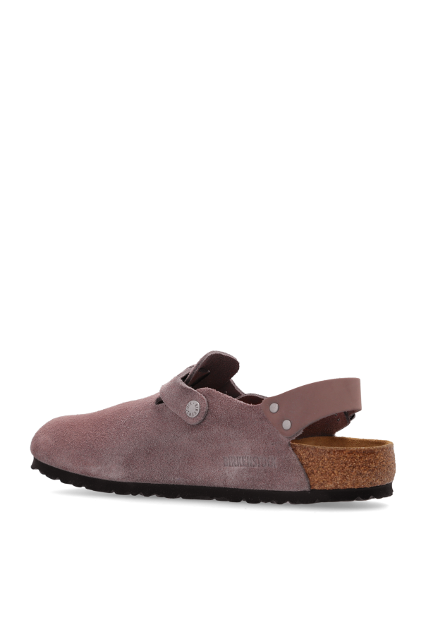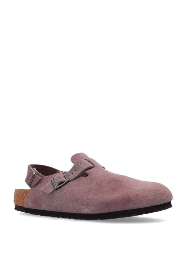 Introducing the Tokio II, an exquisite pair of men\'s flip-flops that seamlessly blend elegance with casual sophistication. Crafted by the legendary brand Birkenstock, these shoes are a testament to the timeless heritage of German shoemaking. These flip-flops feature a classic design with closed toes, reminiscent of sandals, enhanced with adjustable straps and metal buckles on both sides for a perfect fit. The upper is made from luxurious violet suede, exuding an air of refined elegance, while the insole, crafted from natural leather, ensures unparalleled comfort. The cork sole, a signature element of Birkenstock footwear, is complemented by an anti-slip rubber outsole, providing durability and stability. A branded metal buckle on one of the straps and an embossed logo on the side add distinguishing touches that highlight the exclusivity of this model. Why Choose This Product? Classic yet versatile design suitable for various occasions. Adjustable straps with metal buckles for a customized fit. Luxurious violet suede upper and comfortable leather insole. Durable cork sole with an anti-slip rubber outsole. Distinctive branding with an embossed logo and metal buckle.