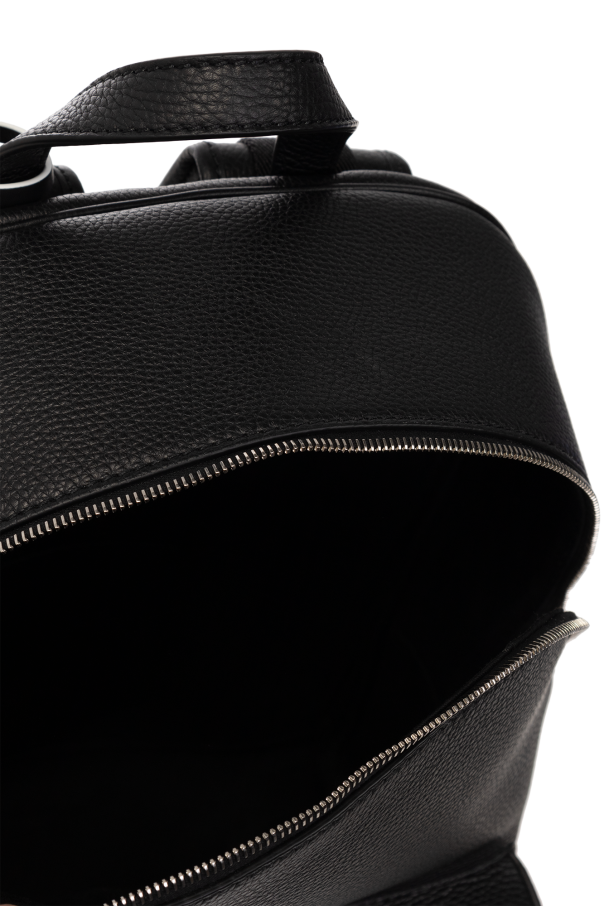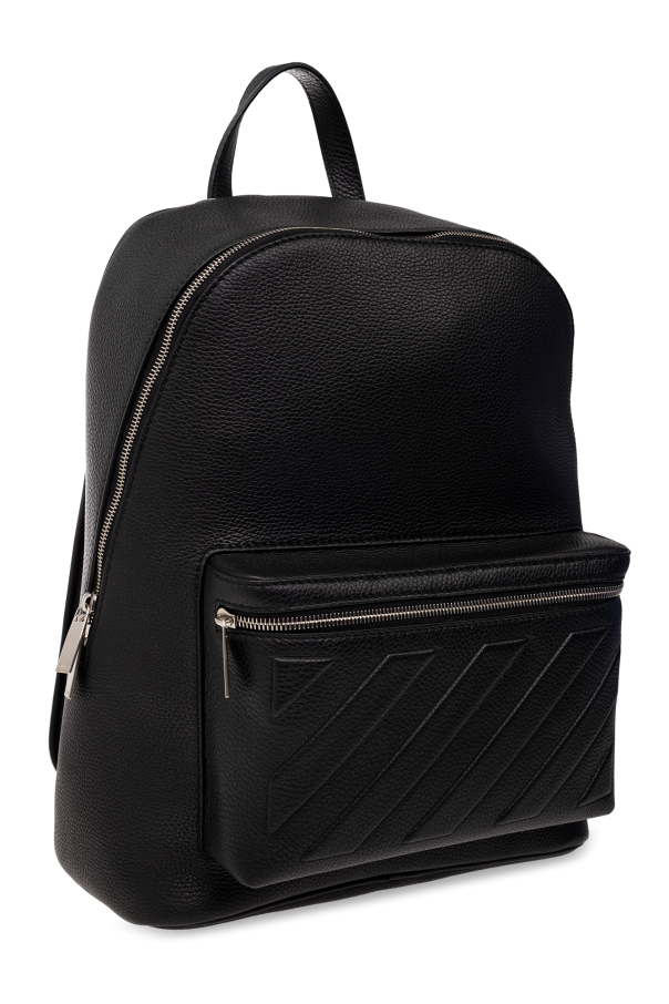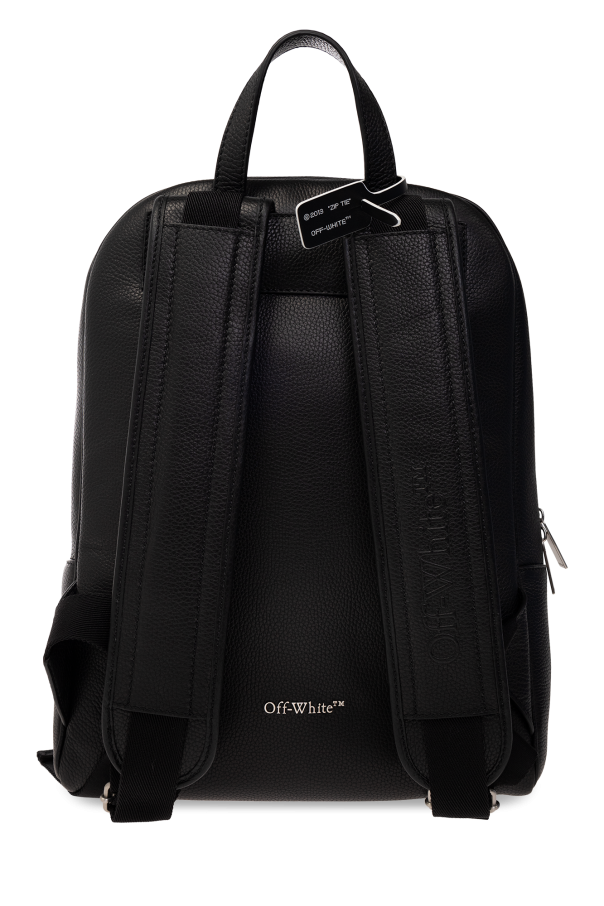 Black backpack from Off-White. Made of calf leather, this design fastens with a two-way zip and features a half-round handle, a zip pocket on the front, adjustable shoulder straps with an embossed logo, silver-tone metal hardware, and one internal compartment with one slip pocket and one card slot.
